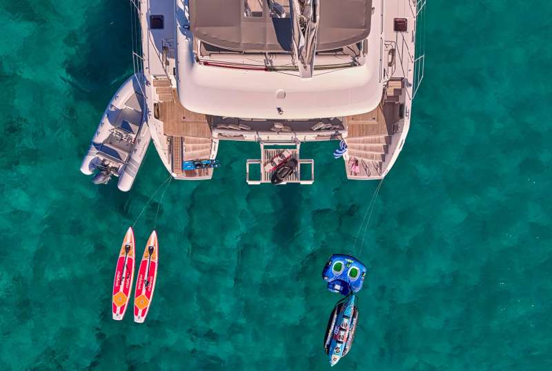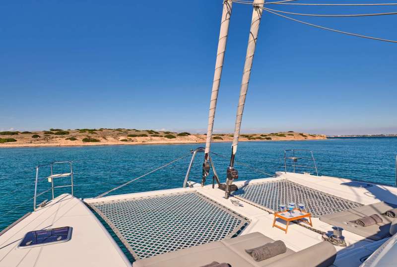 Be aware of an islet in the mid-bay, which is linked to the shore by a reef. The best anchorage lies to the east of this, in 3-4m. The bottom is mainly sand and weeds, so in places, the holding isn’t great. The Meltemi can cause some turbulence and swells, so only use it in light northerly wind conditions at most.