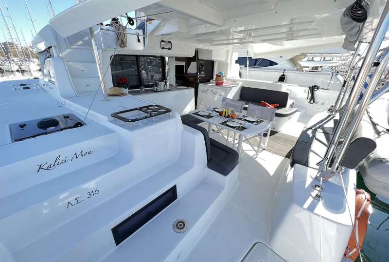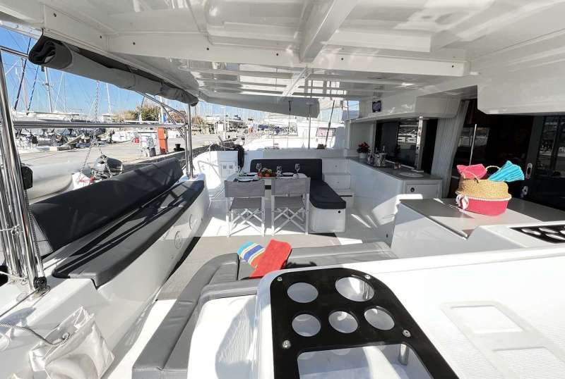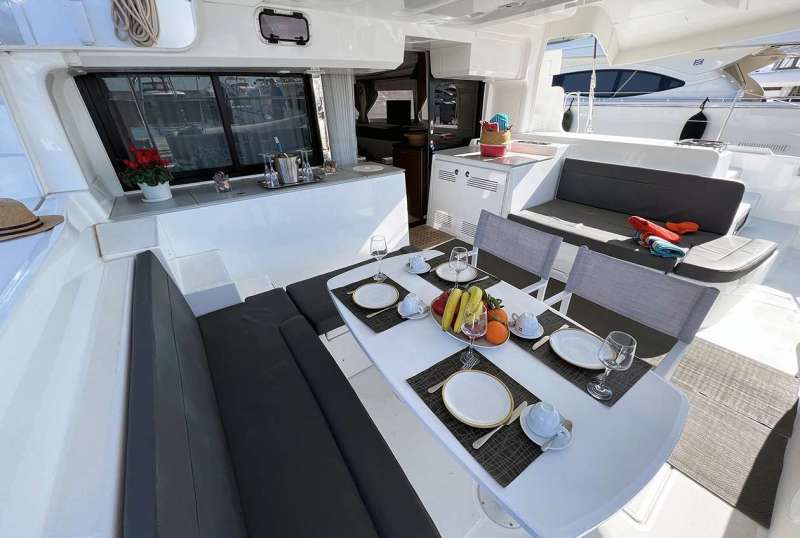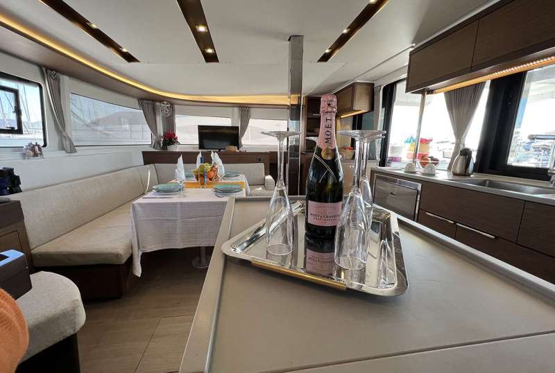 In many catamarans, the bar area is smartly integrated as part of the galley, or positioned as a transitional space between the saloon and the aft deck. This setup not only maximizes the use of space but also enhances the flow between indoor and outdoor areas, making it perfect for socializing and entertaining. For instance, the Catamaran Tiamo, shown in the picture below, showcases this concept beautifully with a bar that serves both the saloon and opens up to the aft deck. This allows guests to easily mingle between the cozy interior and the open-air deck, enjoying a seamless interaction with both environments.