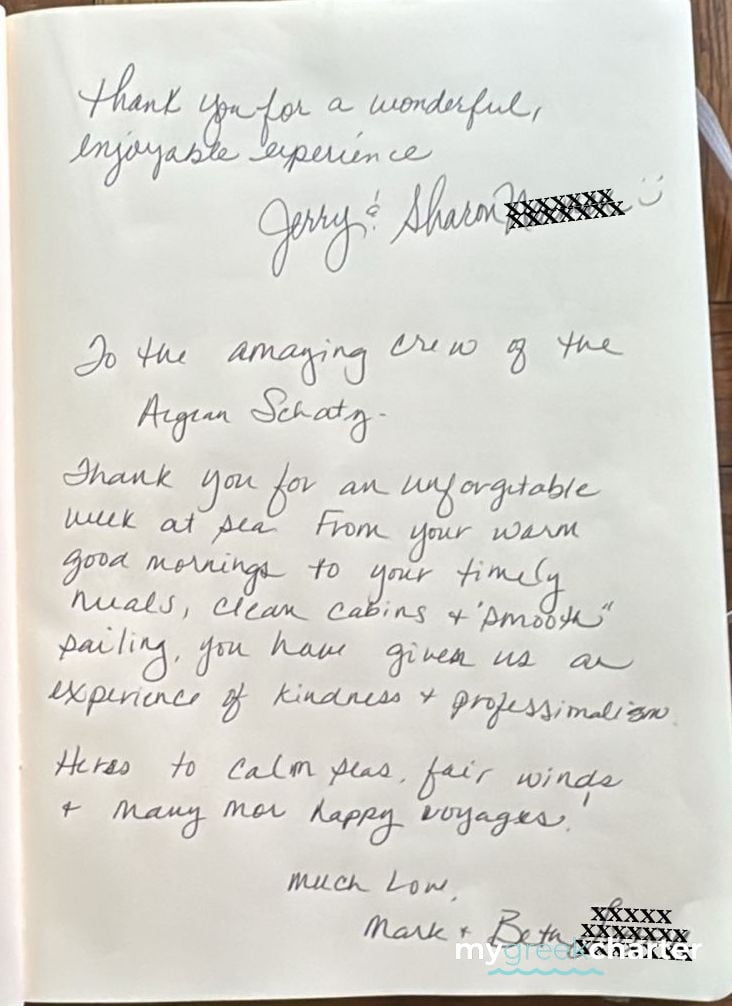 All areas have been 5 stars! It will be hard to adjust to a regular routine. The service from the crew has been so good and it's obvius that it comes from their hearts. Also wonderful cruising and great seamanship by the captain and crew! This has been one of the best vacation ever! All five stars!