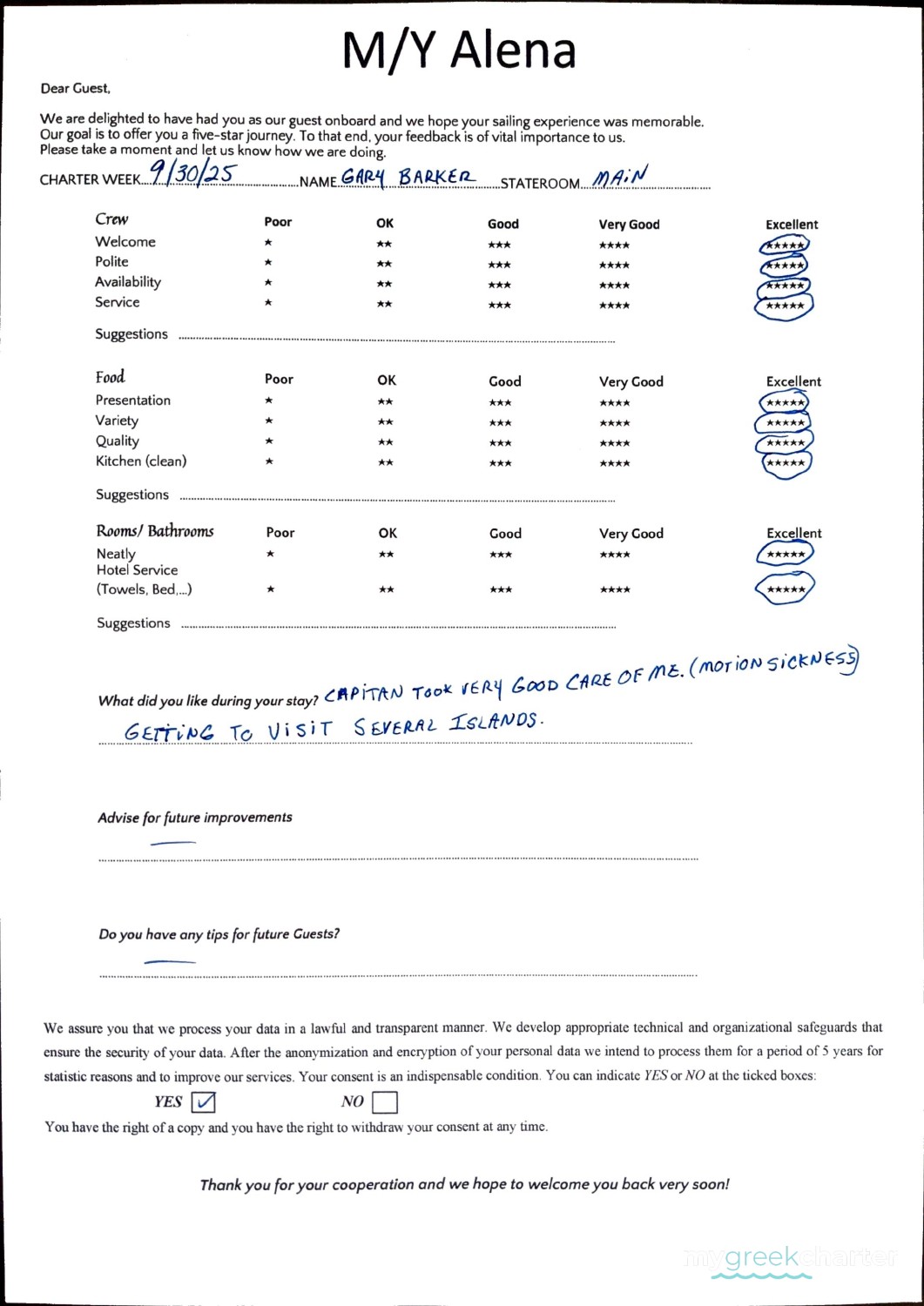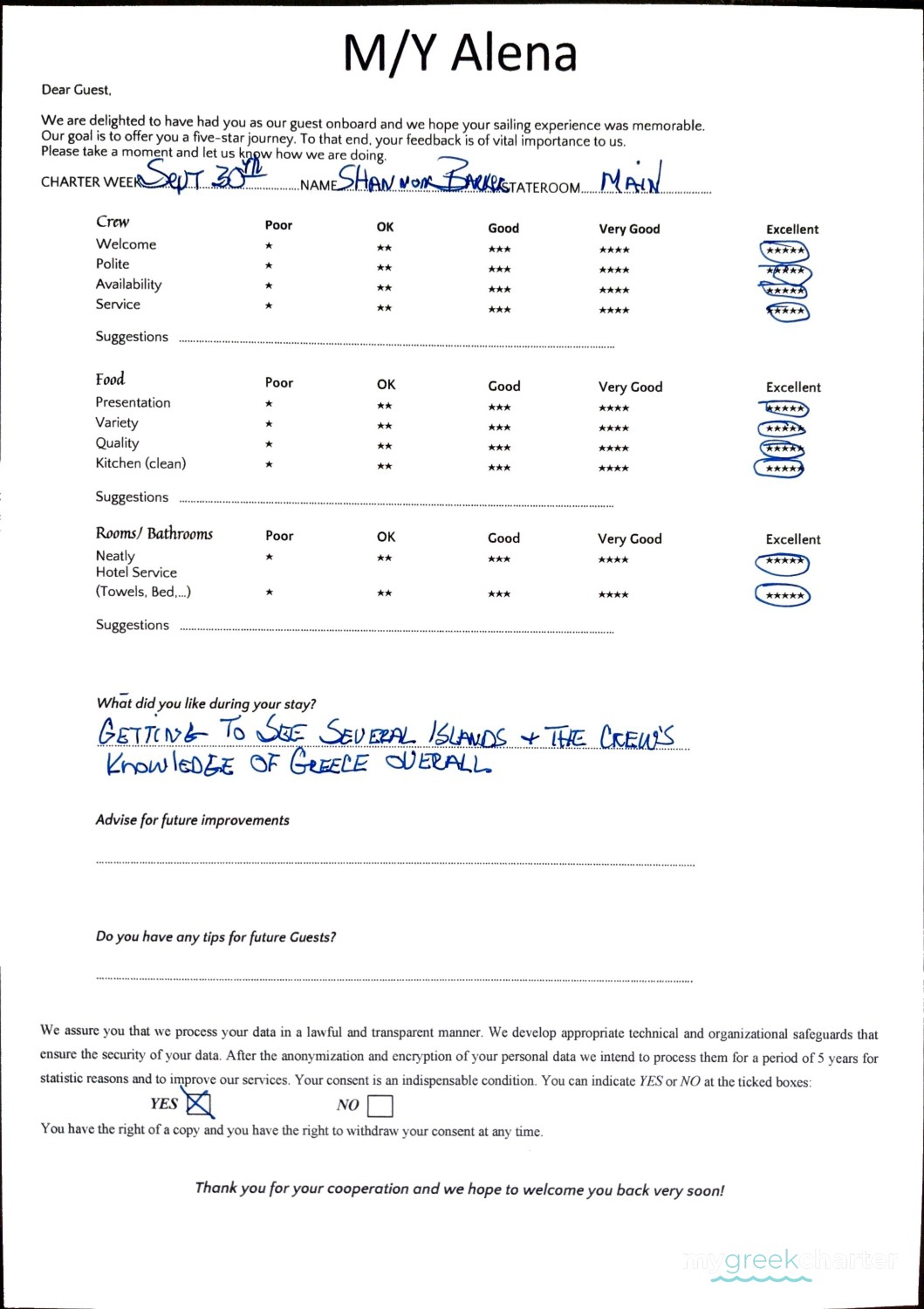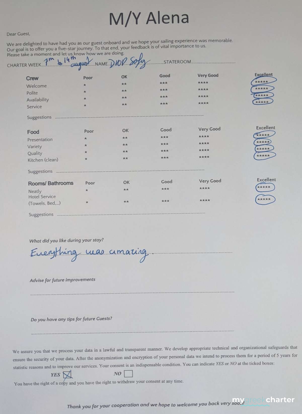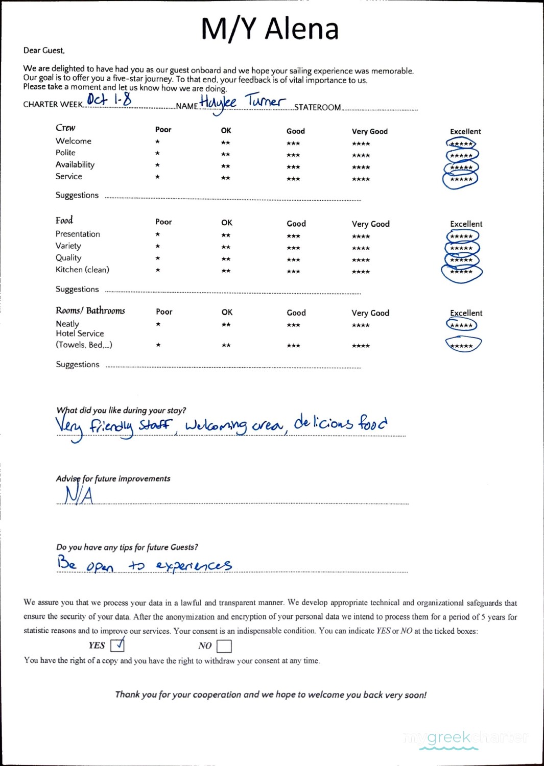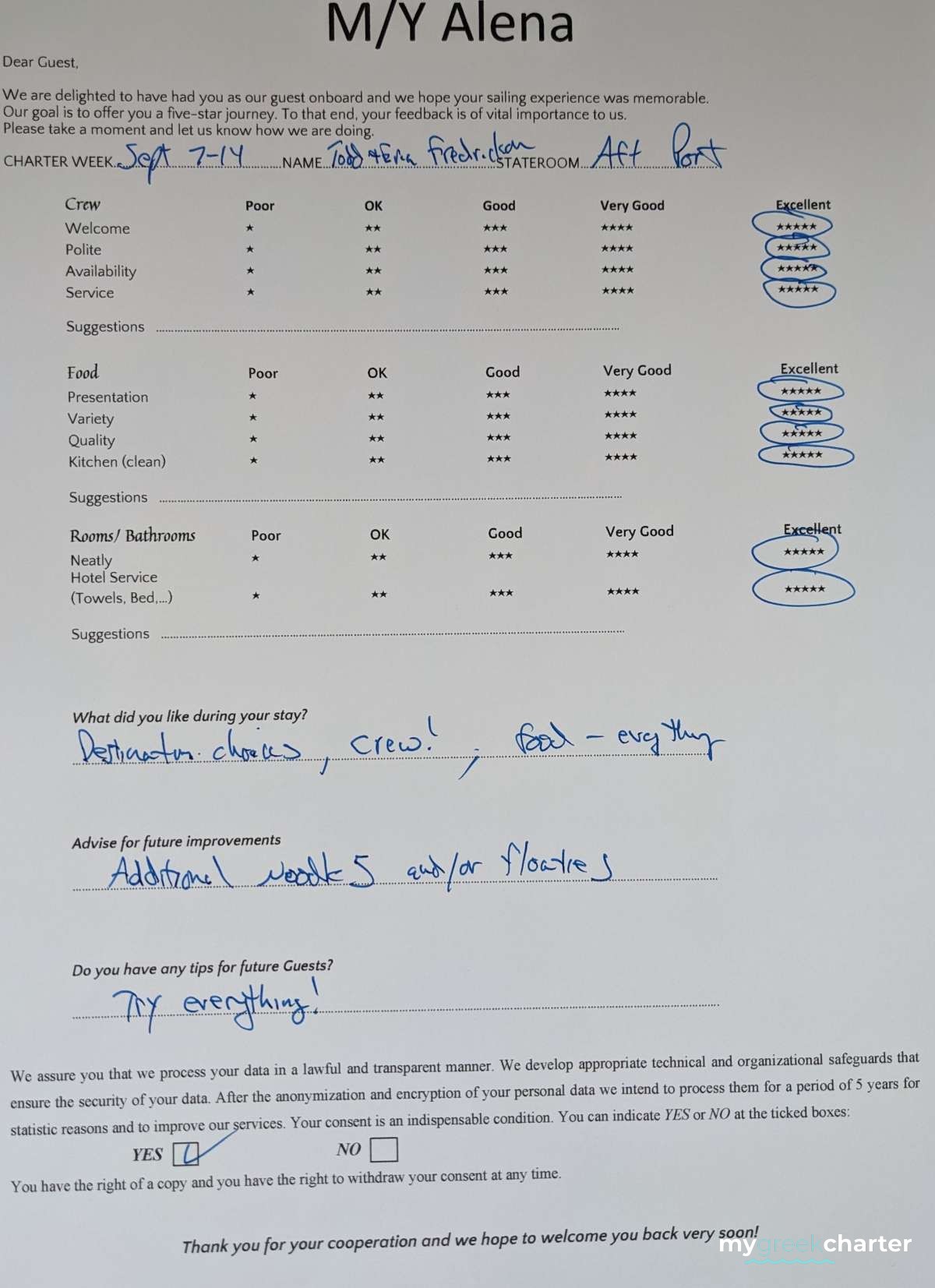 * Please note due to logistics, charters with embarkation or disembarkation in Santorini will be charged one extra day + 6,5% VAT.