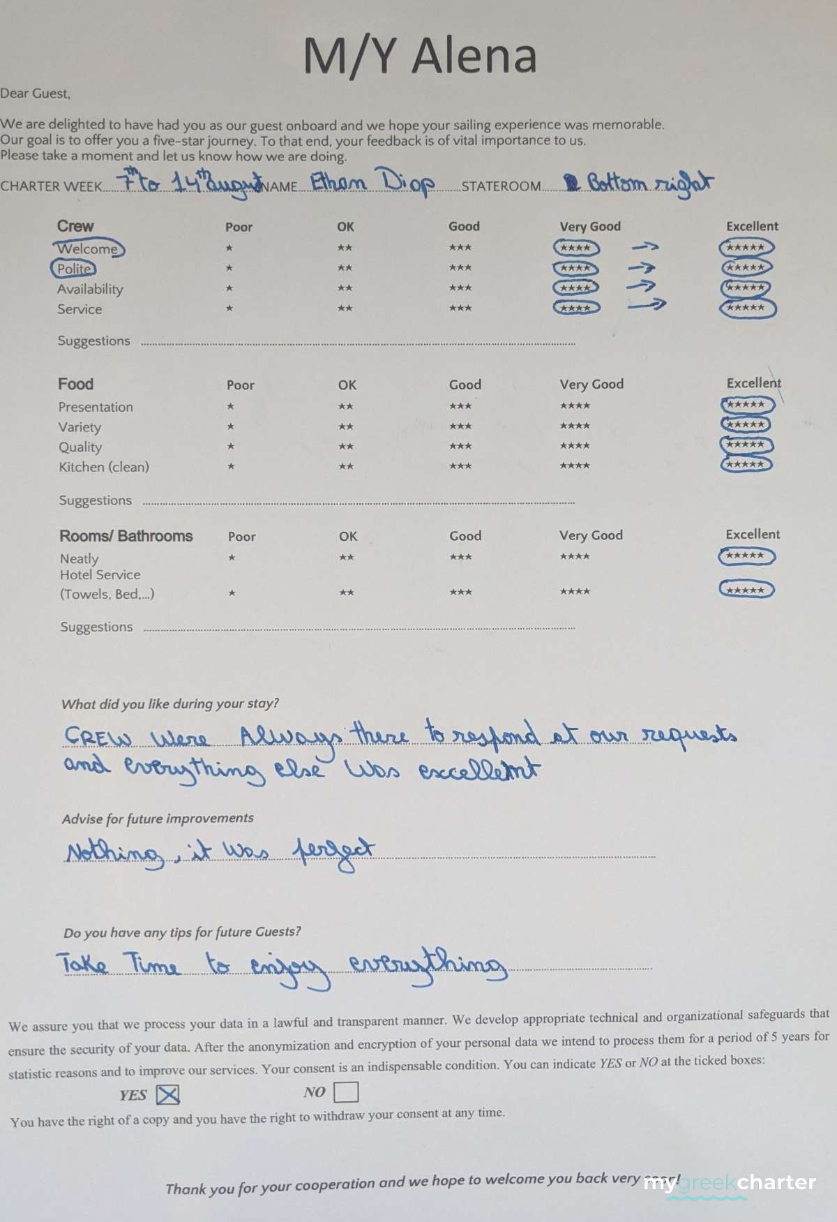 For a power catamaran like ALENA, the expected APA is 20% to 35% of the charter price (€6,800 - €11,900), making the charter cost €40,800 to €45,900. Exact amount will be confirmed after inquiry.
