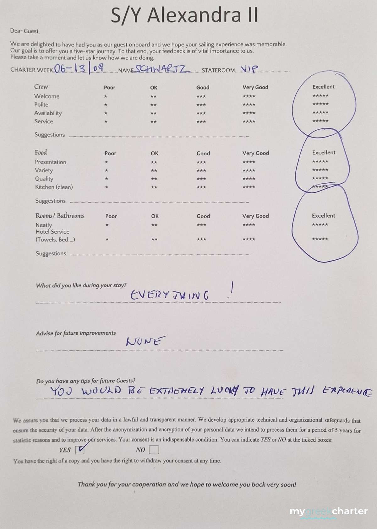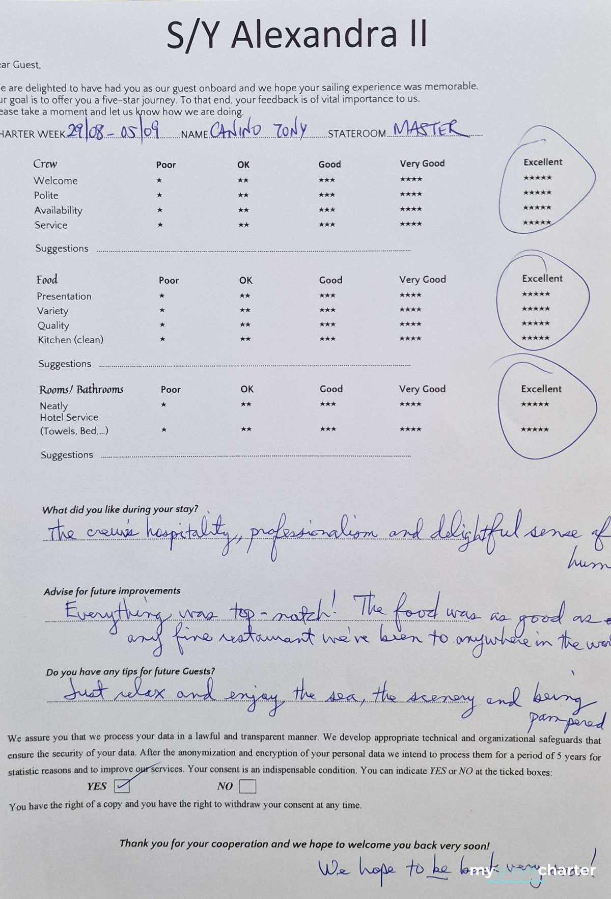 For a sailing catamaran like ALEXANDRA II, the expected APA is 20% to 35% of the charter price (€6,500 - €11,375), making the charter cost €39,000 to €43,875. Exact amount will be confirmed after inquiry.