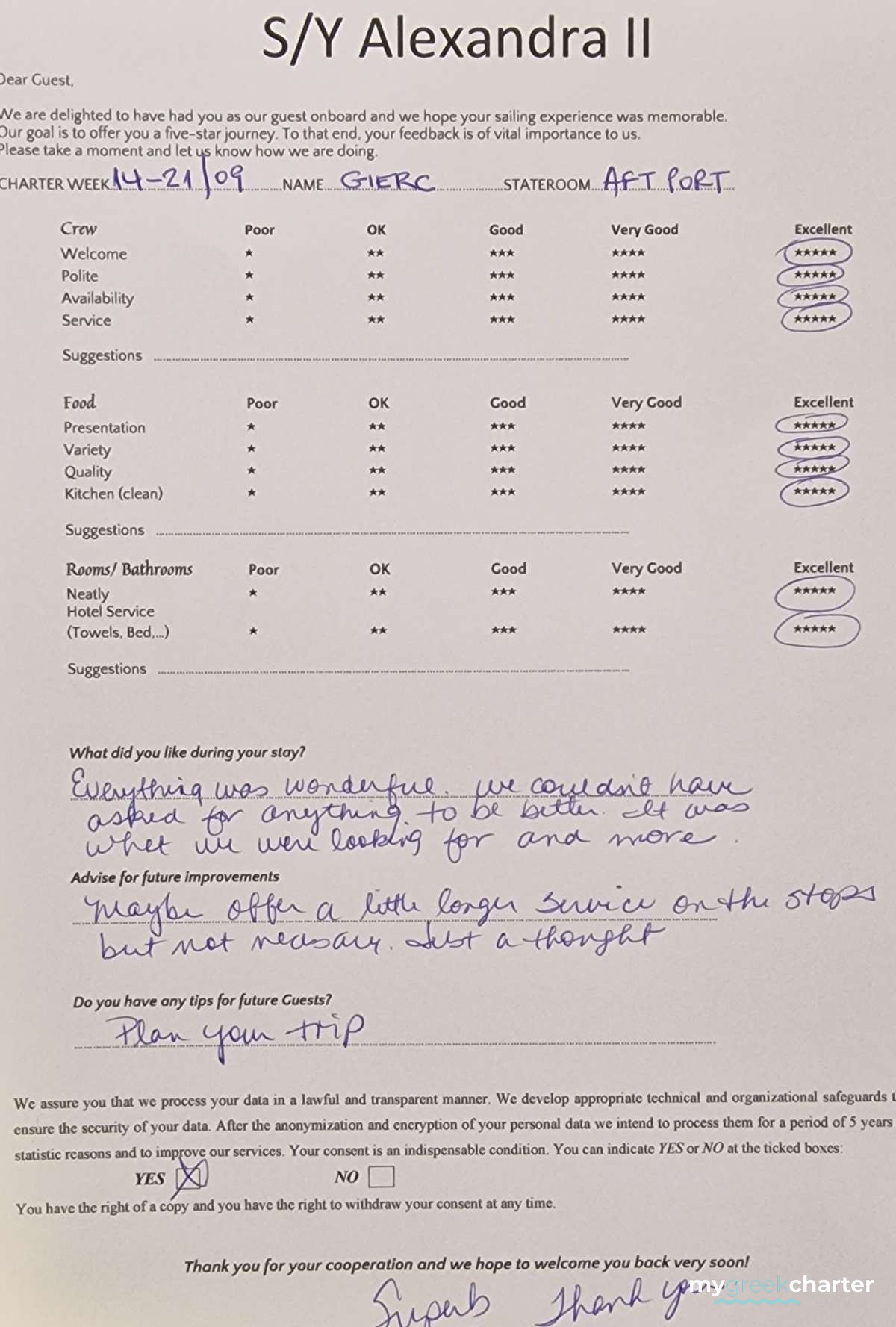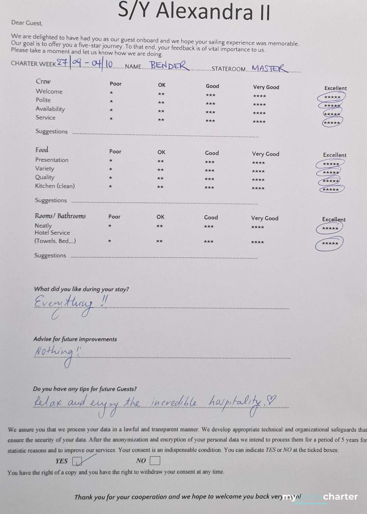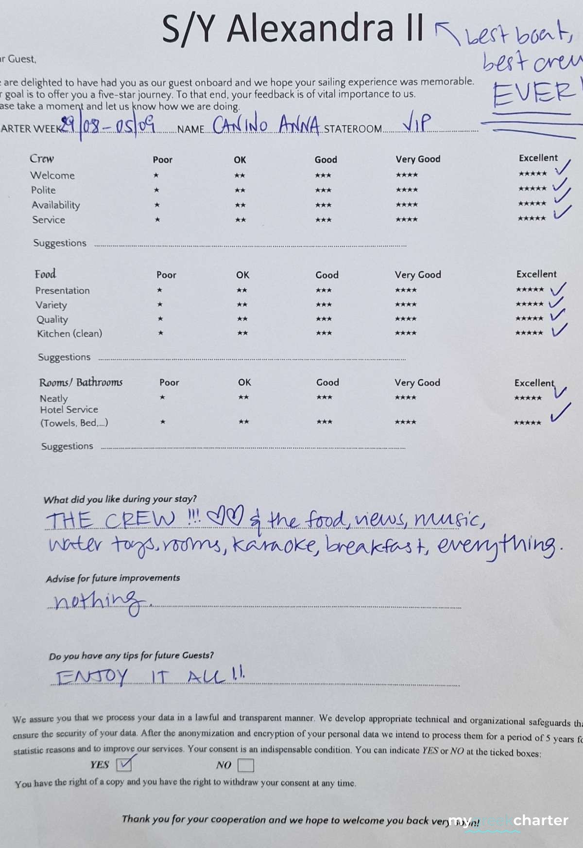 * Please note due to logistics, charters with embarkation or disembarkation in Santorini will be charged one extra day + 6,5% VAT.