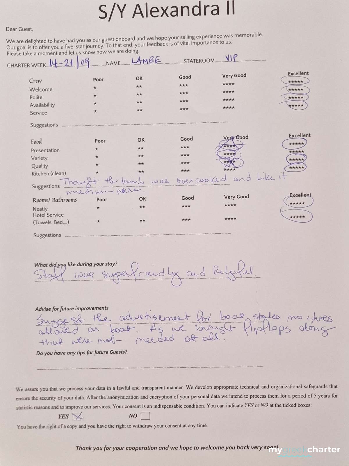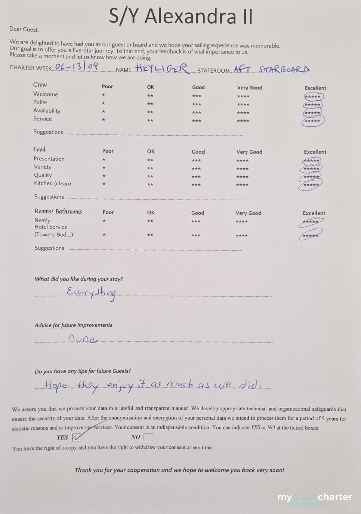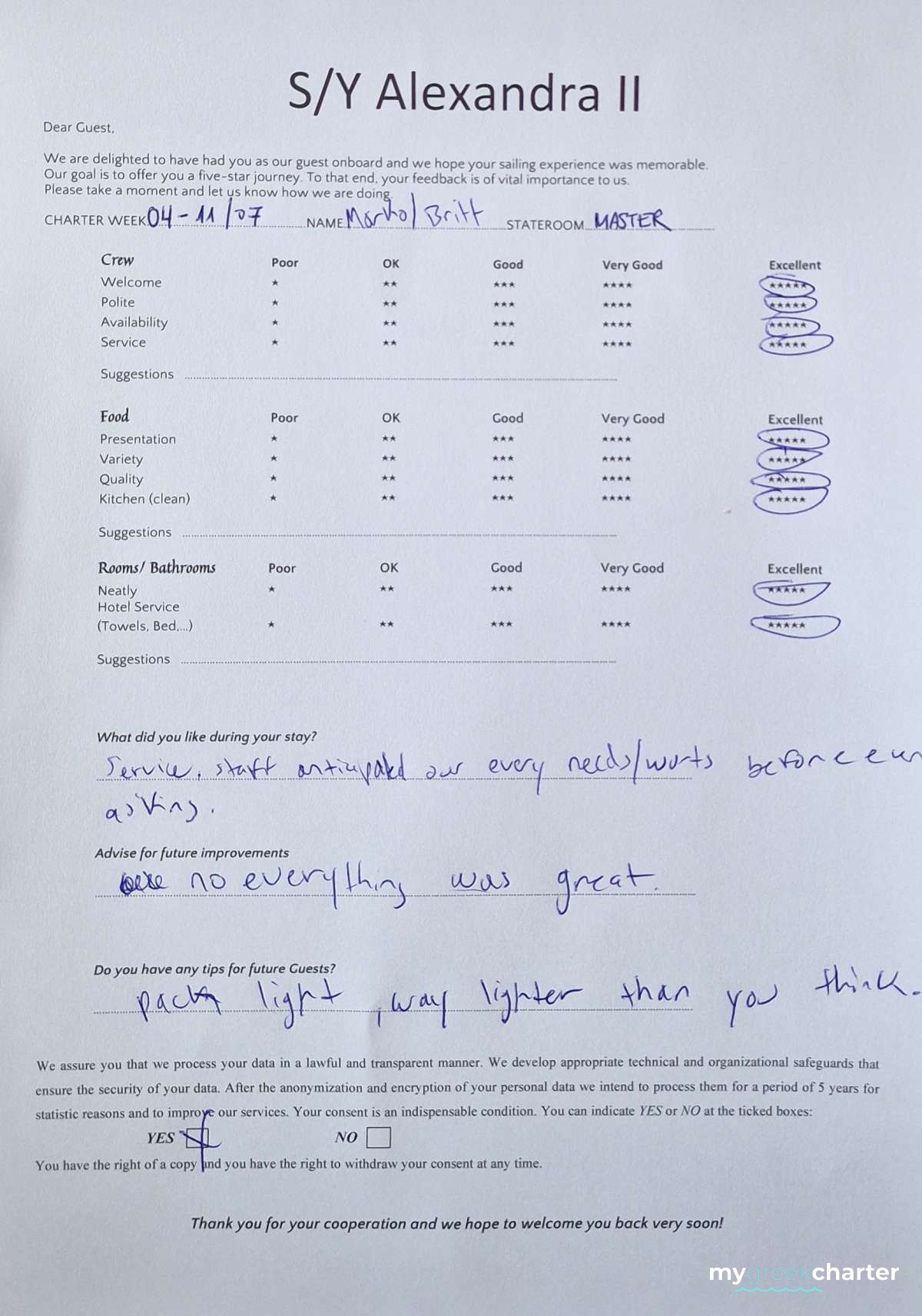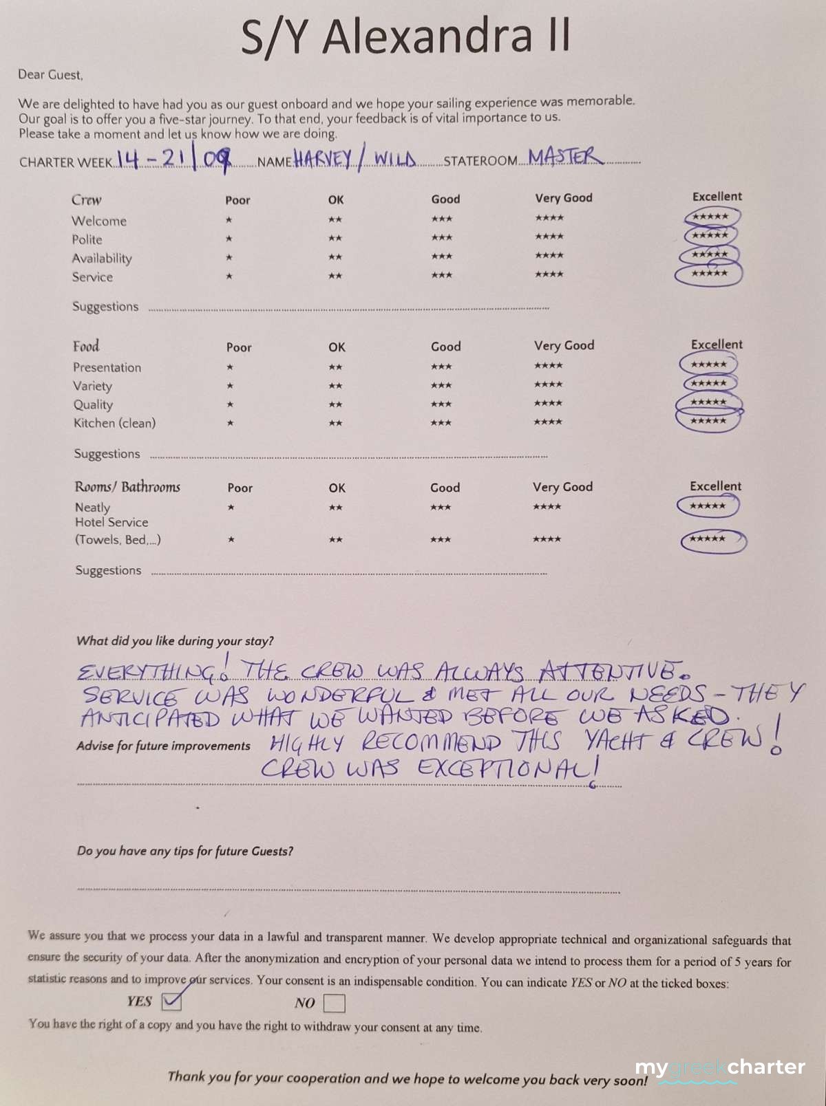 * Please note due to logistics, charters with embarkation or disembarkation in Santorini will be charged one extra day + 6,5% VAT.