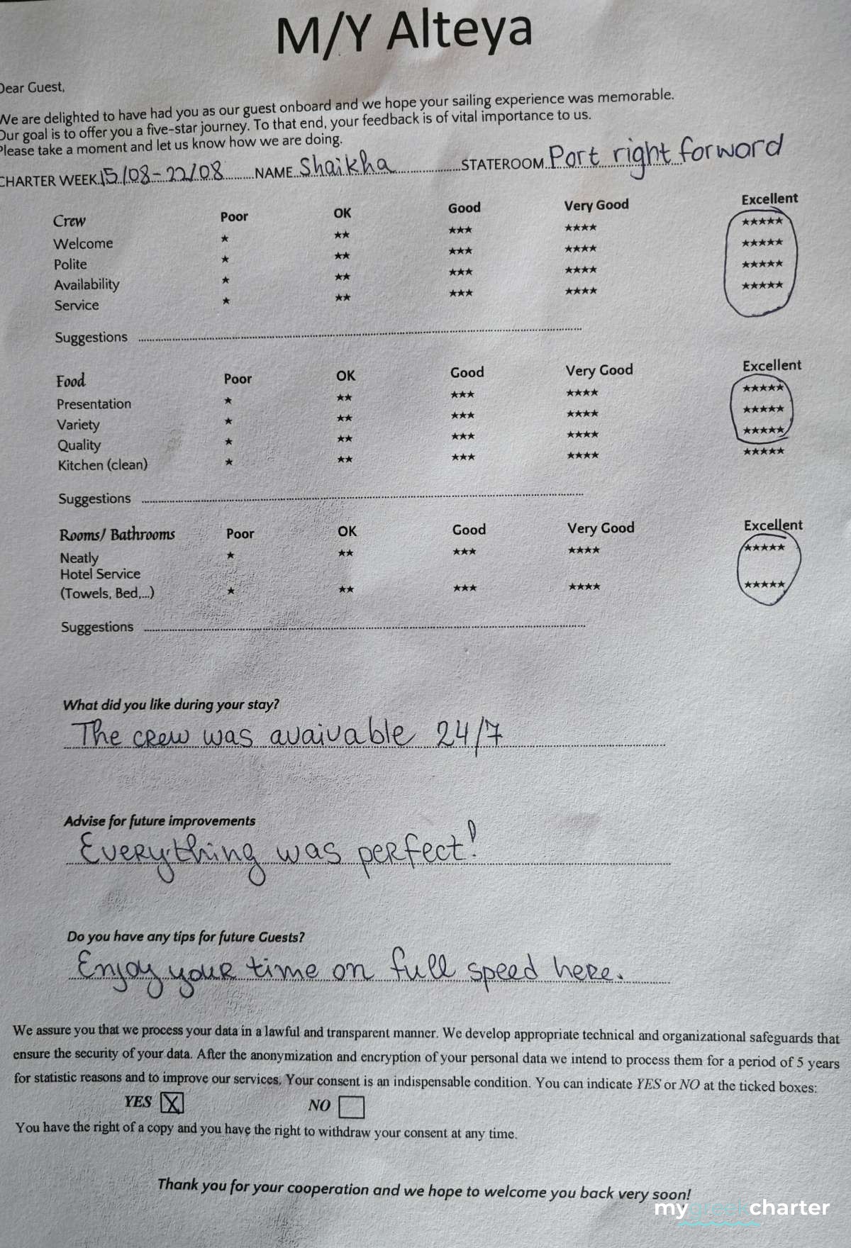 For a power catamaran like ALTEYA, the expected APA is 20% to 35% of the charter price (€9,800 - €17,150), making the charter cost €58,800 to €66,150. Exact amount will be confirmed after inquiry.