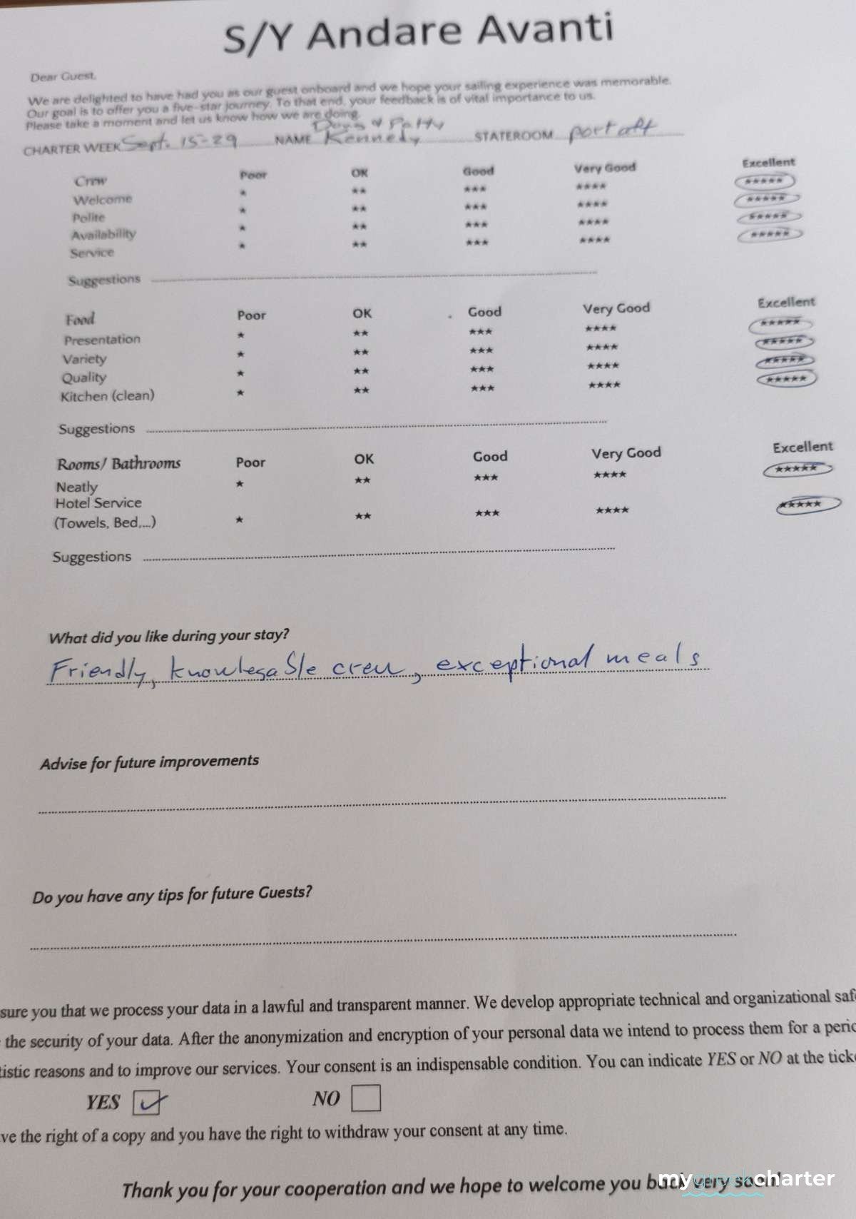 Kostas was an excellent Captain. While we gave him our itinerary he was always looking for ideal places to dock for a few hours or overnight. Rather than being in a busy and possibly noisy port we went to sleep and woke in beautiful quiet coves. He was always researching the areas ahead and finding spectacular places. He kept up the APA and shared with Elton every few days as we requested. Kostas always kept up with maintaining and services parts of the boat, keeping everything “ship shape” . I was surprised to see how much a captain is required to know about the mechanics of the boat. He always asked if we needed anything and was available at all hours. Kostas treated Orpheus as a partner and they worked so well together.