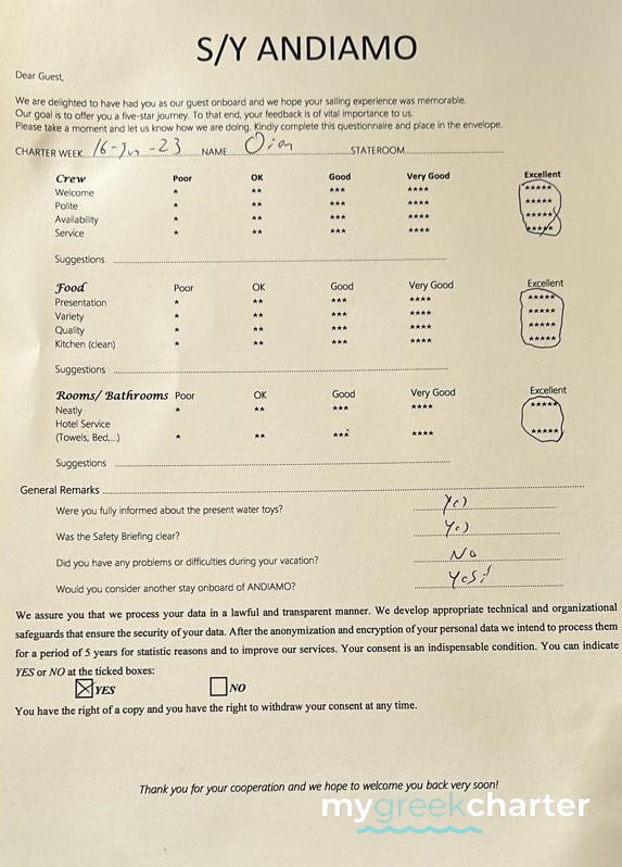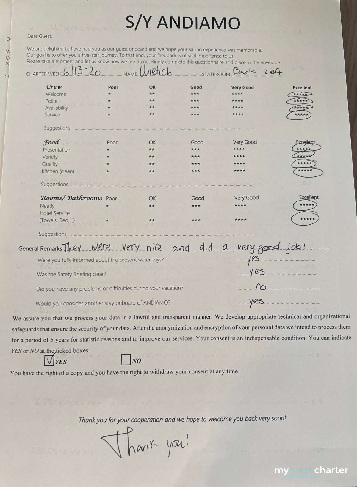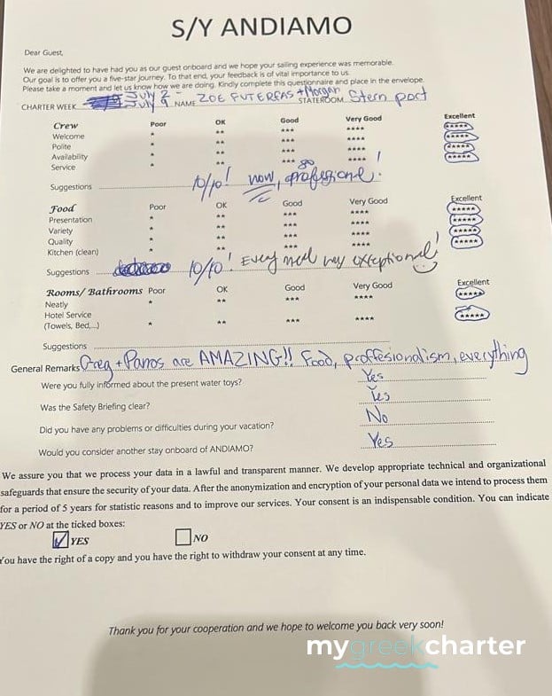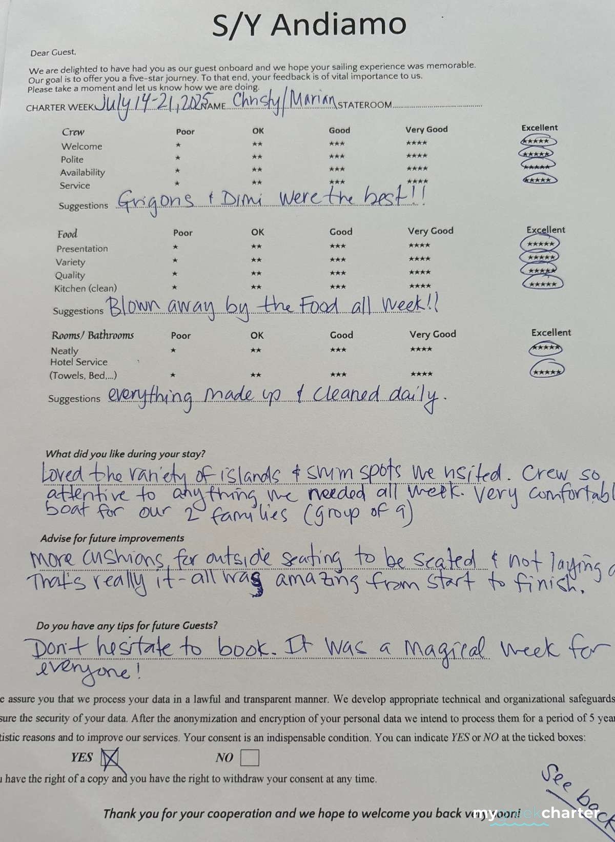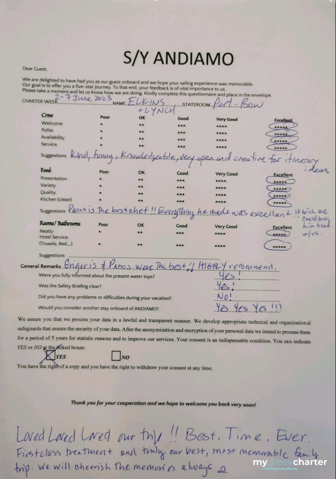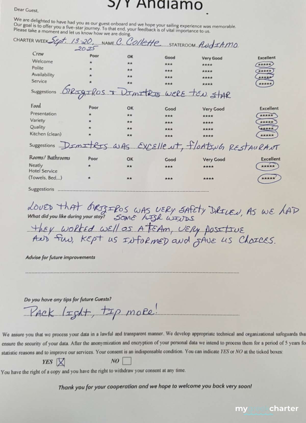 Grigoris is a very responsible and considerate sailor, always ensuring his guests’ privacy, yet being always attentive.