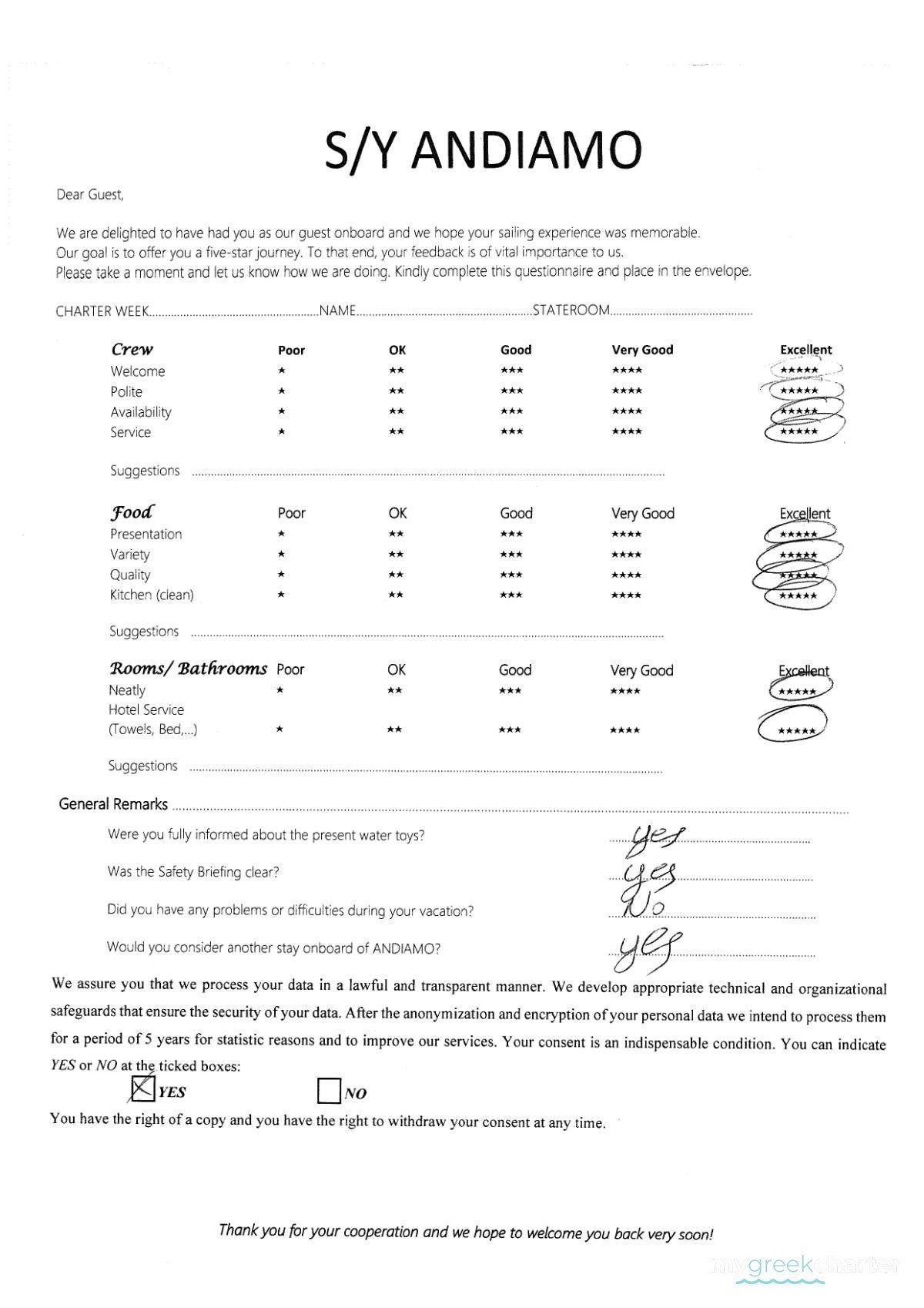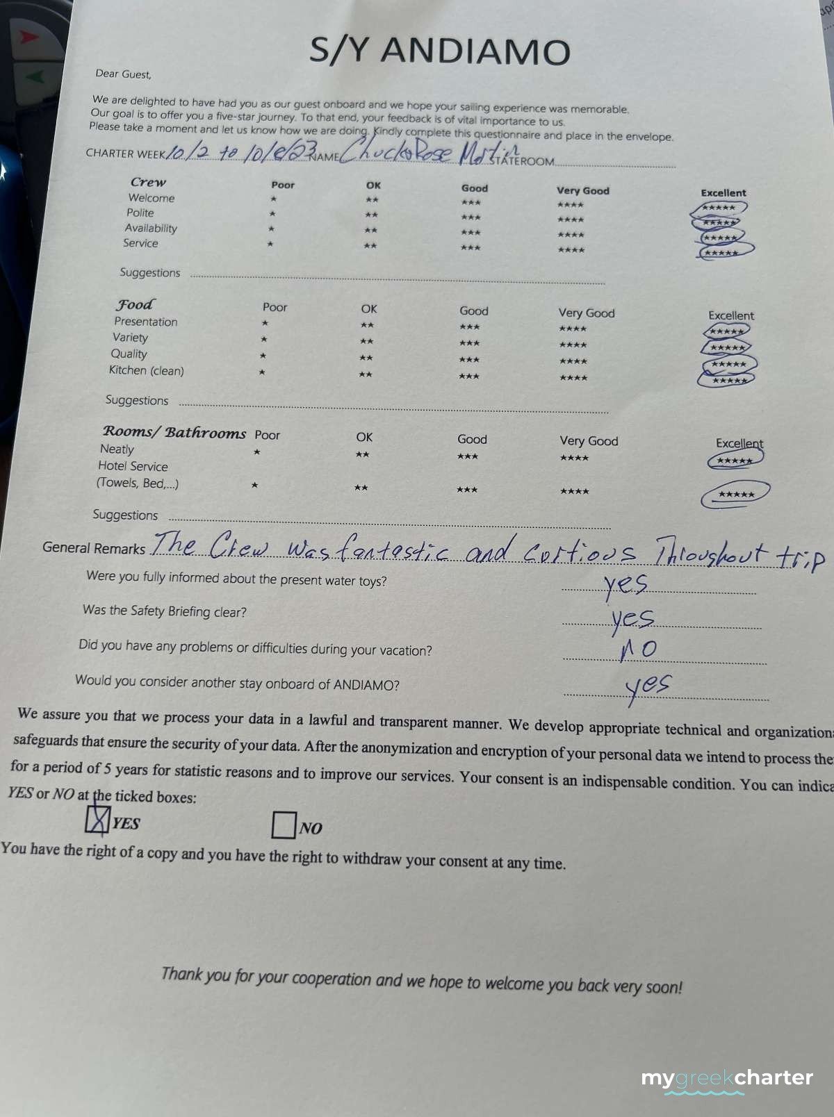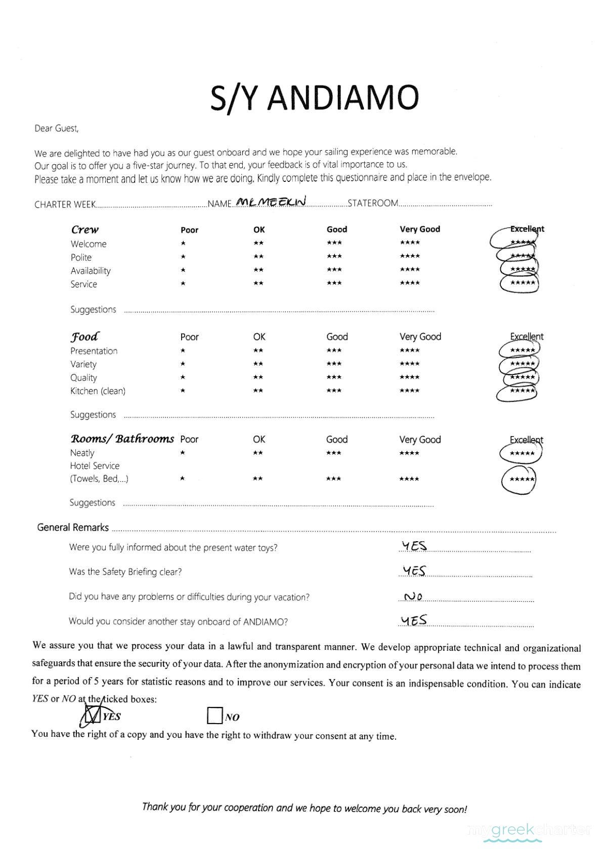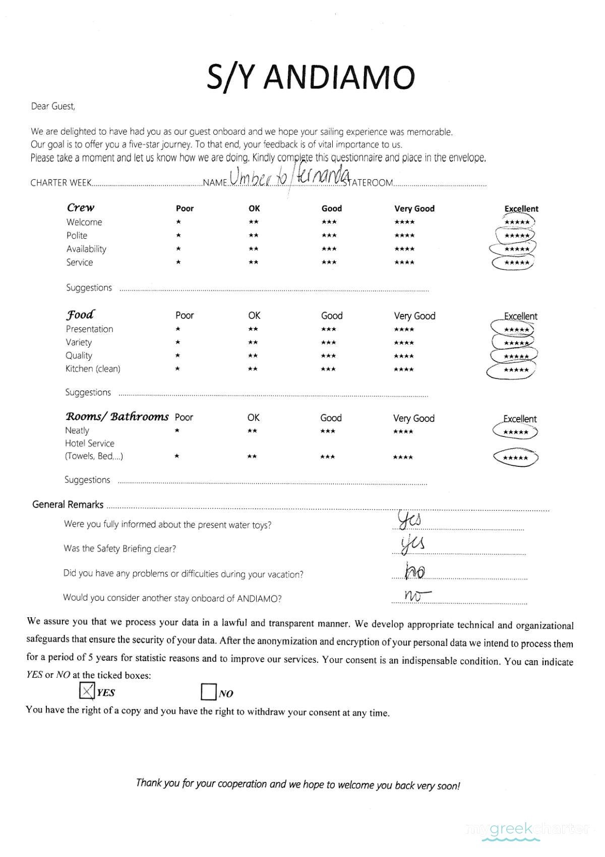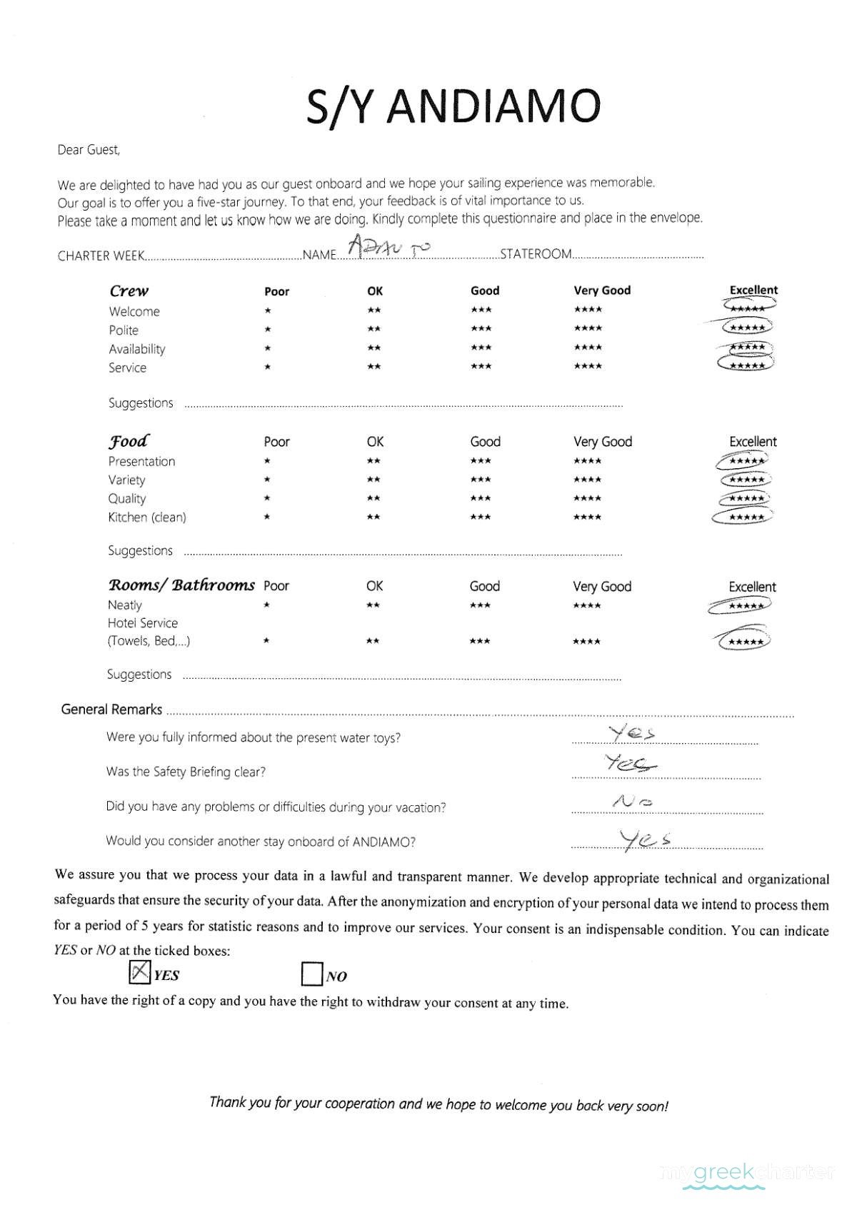 Grigoris holds an offshore as well as speed boat license and regularly updates his safety and first aid skills. He is a non-smoker, enjoys a healthy and sportive lifestyle and fluently speaks English next to his mother tongue, Greek.