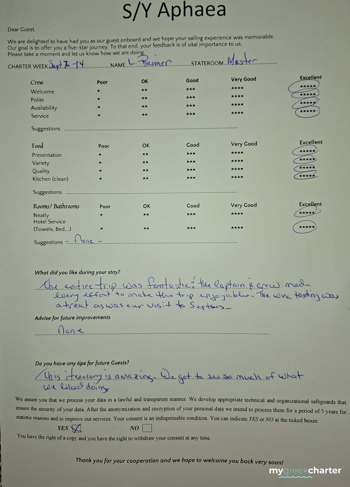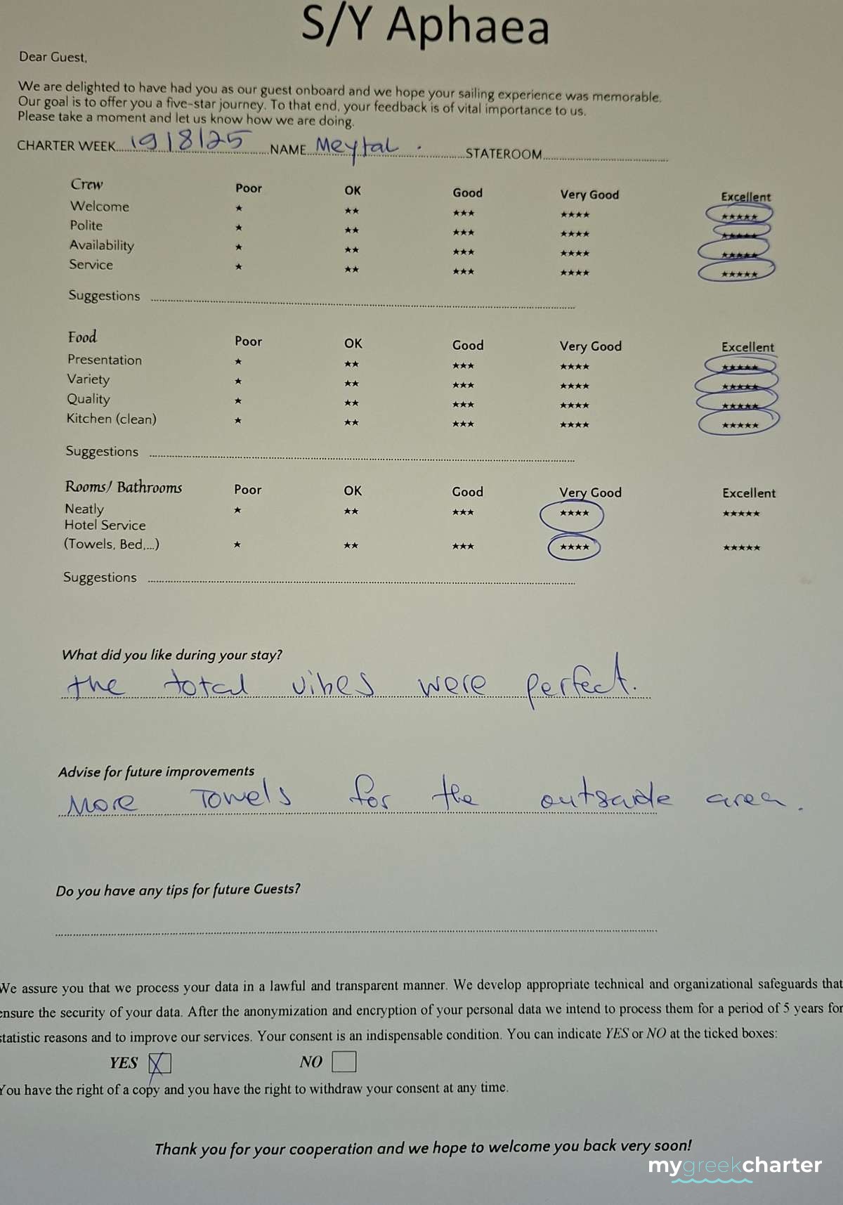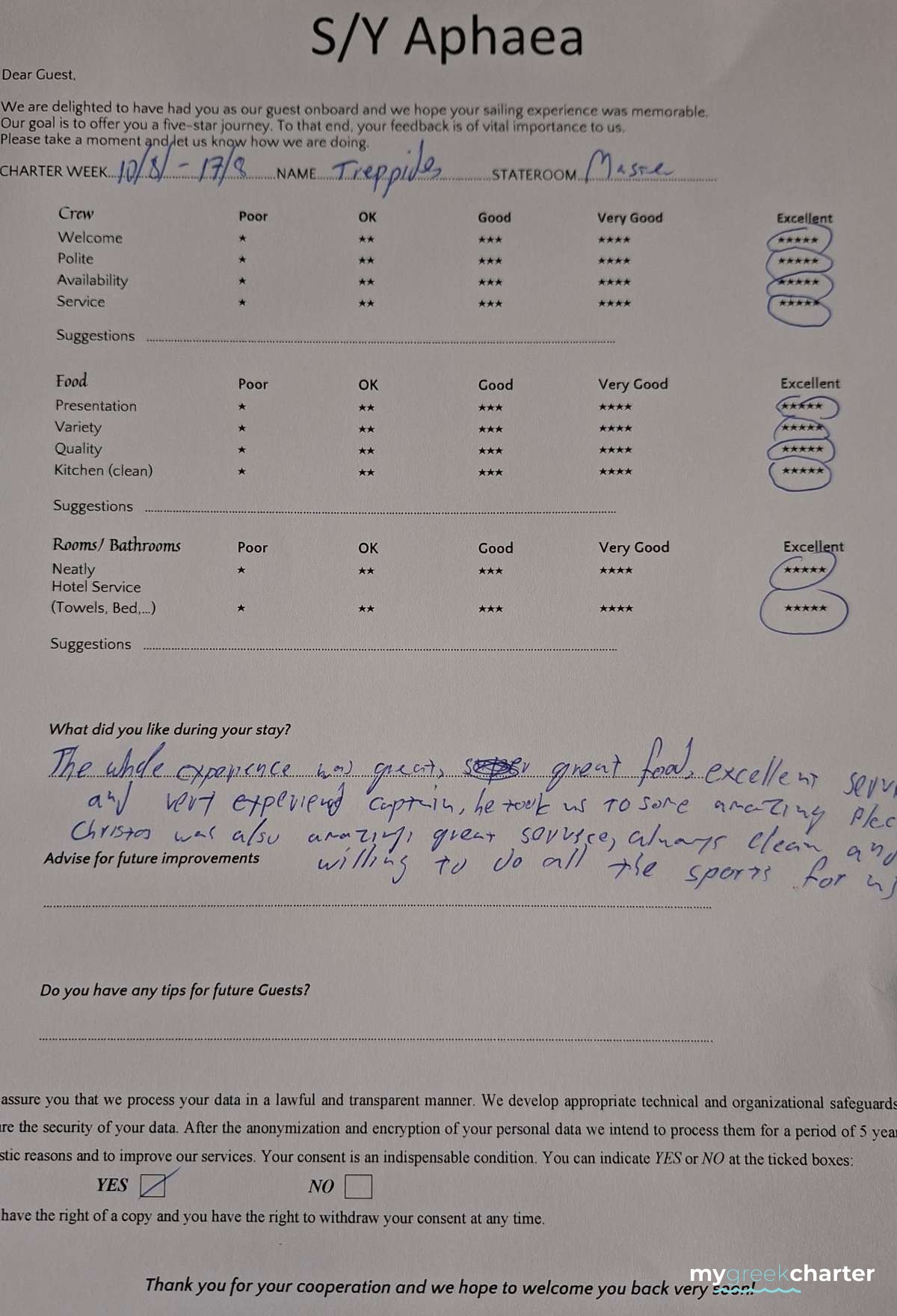 * Please note due to logistics, charters with embarkation or disembarkation in Santorini will be charged one extra day + 6,5% VAT.