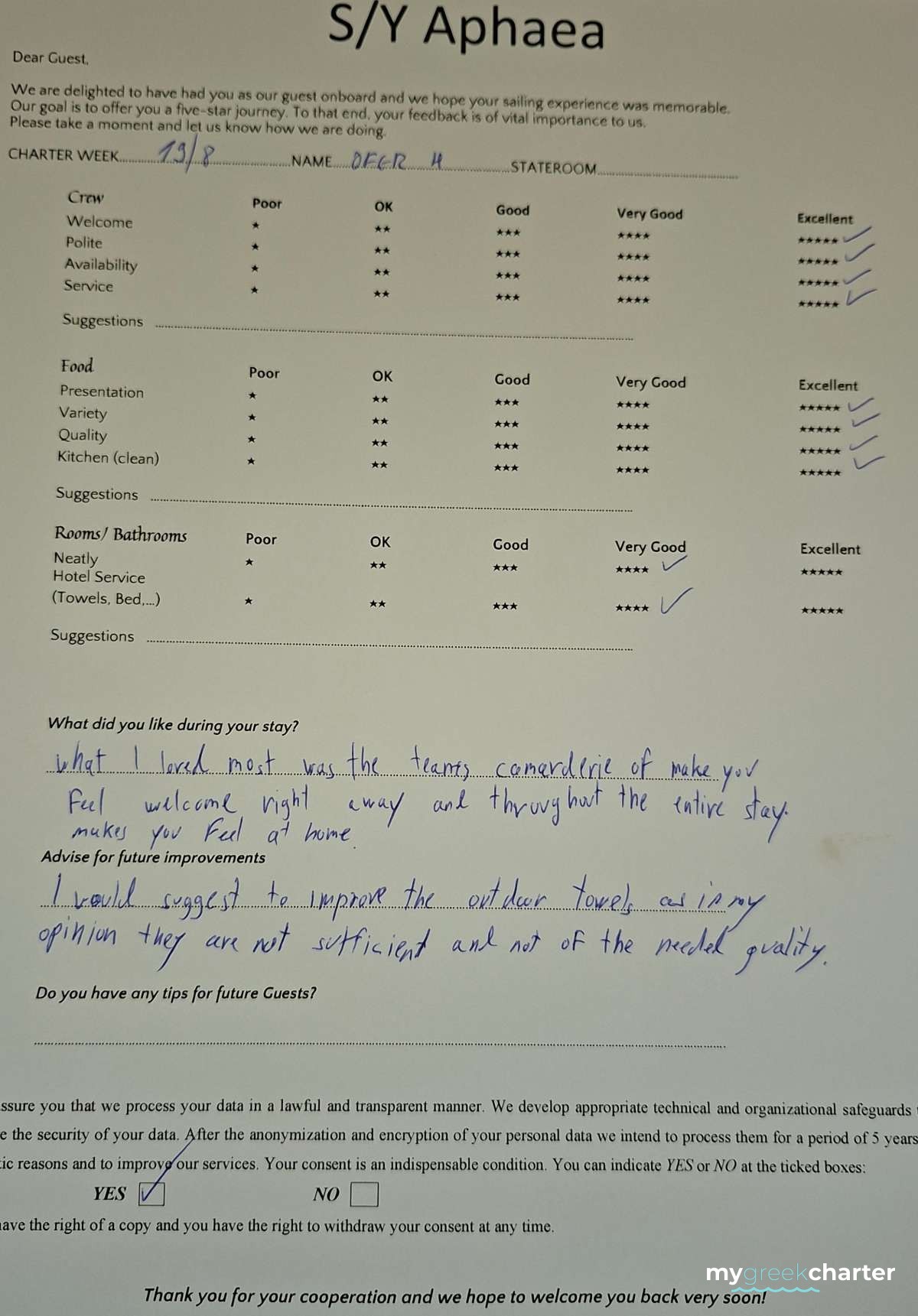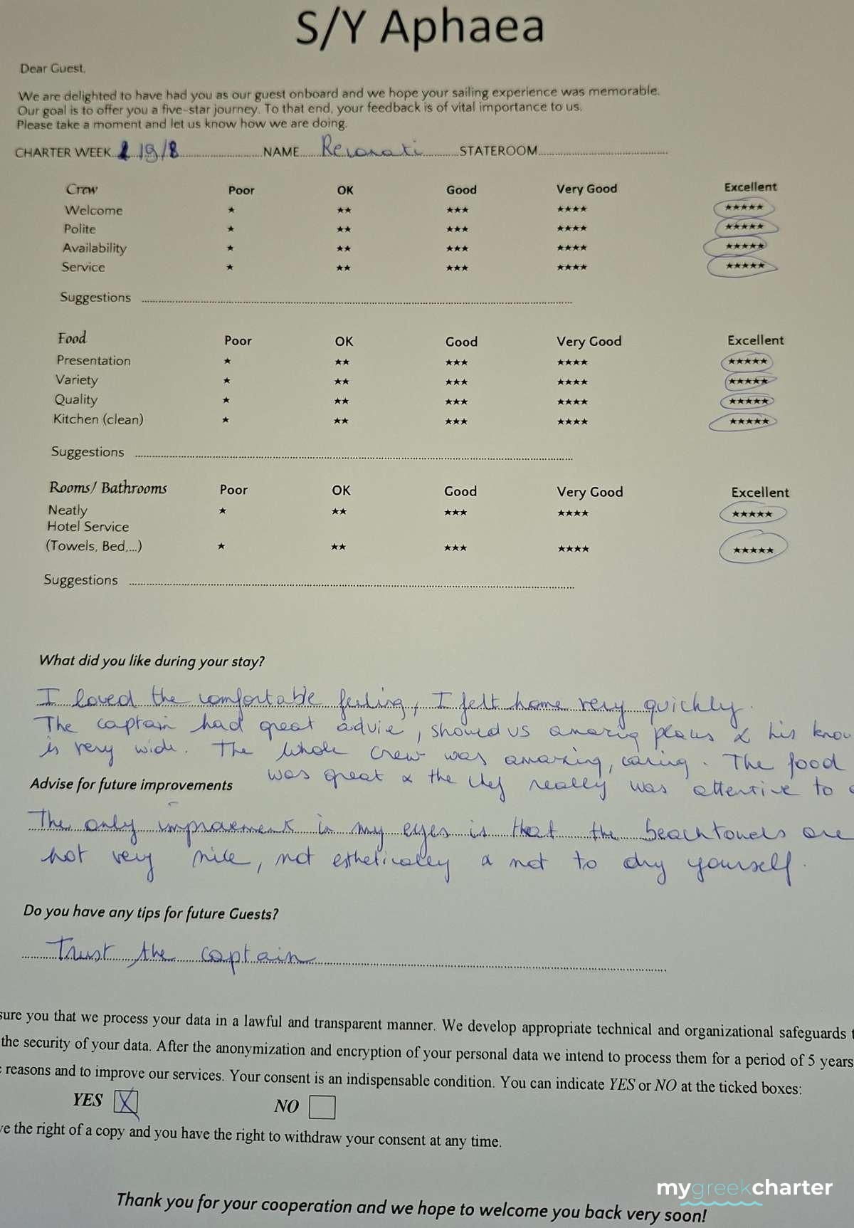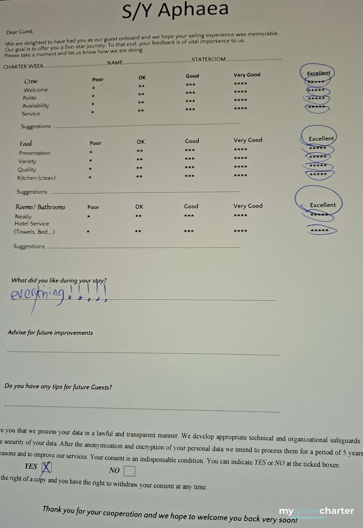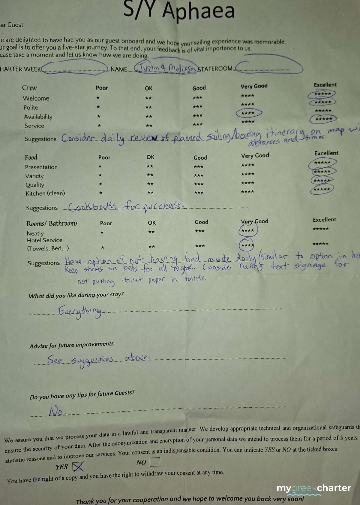 * Please note due to logistics, charters with embarkation or disembarkation in Santorini will be charged one extra day + 6,5% VAT.