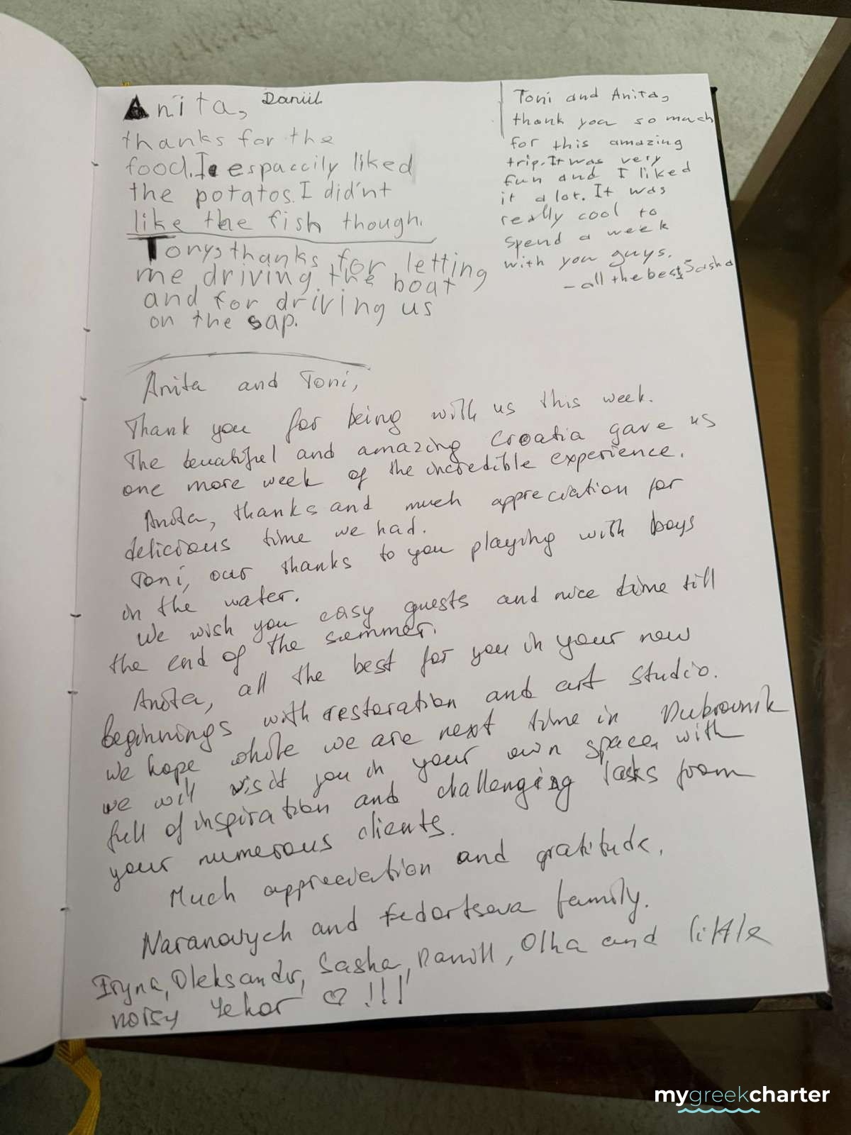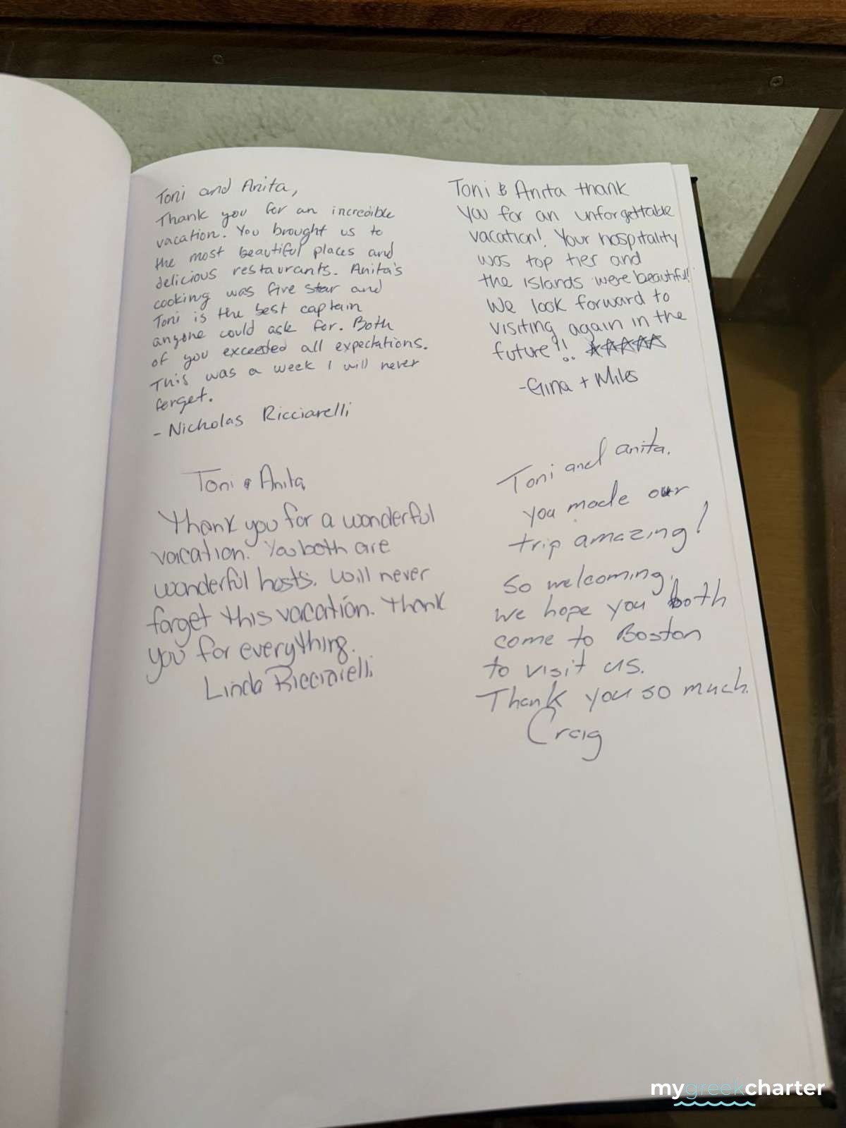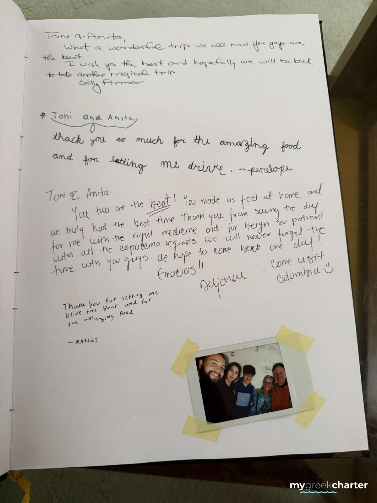 Thank you for an incredible vacation. You brought us to the most beautiful places and delicious restaurants. Anita's cooking was five stars, and Toni is the best captain anyone could ask for. Both of you exceeded all expectations. This was a week I will never forget.