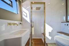 EVITA is classified primarily as a power catamaran. The yacht layout radiates from the main saloon, which connects to the aft deck. The aft deck is generous, with a prominent dining and seating area and usually it is where you, as a charter guest, spend most of your time. The modern cabins are located below the main saloon, connected by stairs (inquire about handicapped access). The cabins are located below the main saloon, connected by stairs (inquire about handicapped access). Multiple portholes supply a sunny feeling, with the option for darkness and privacy.