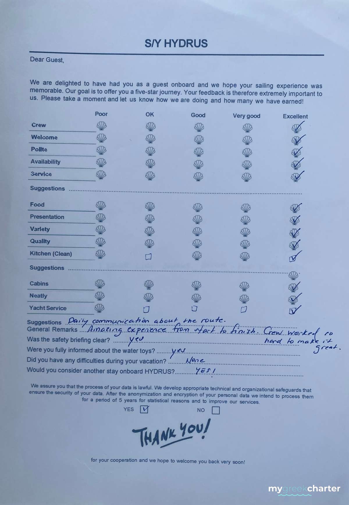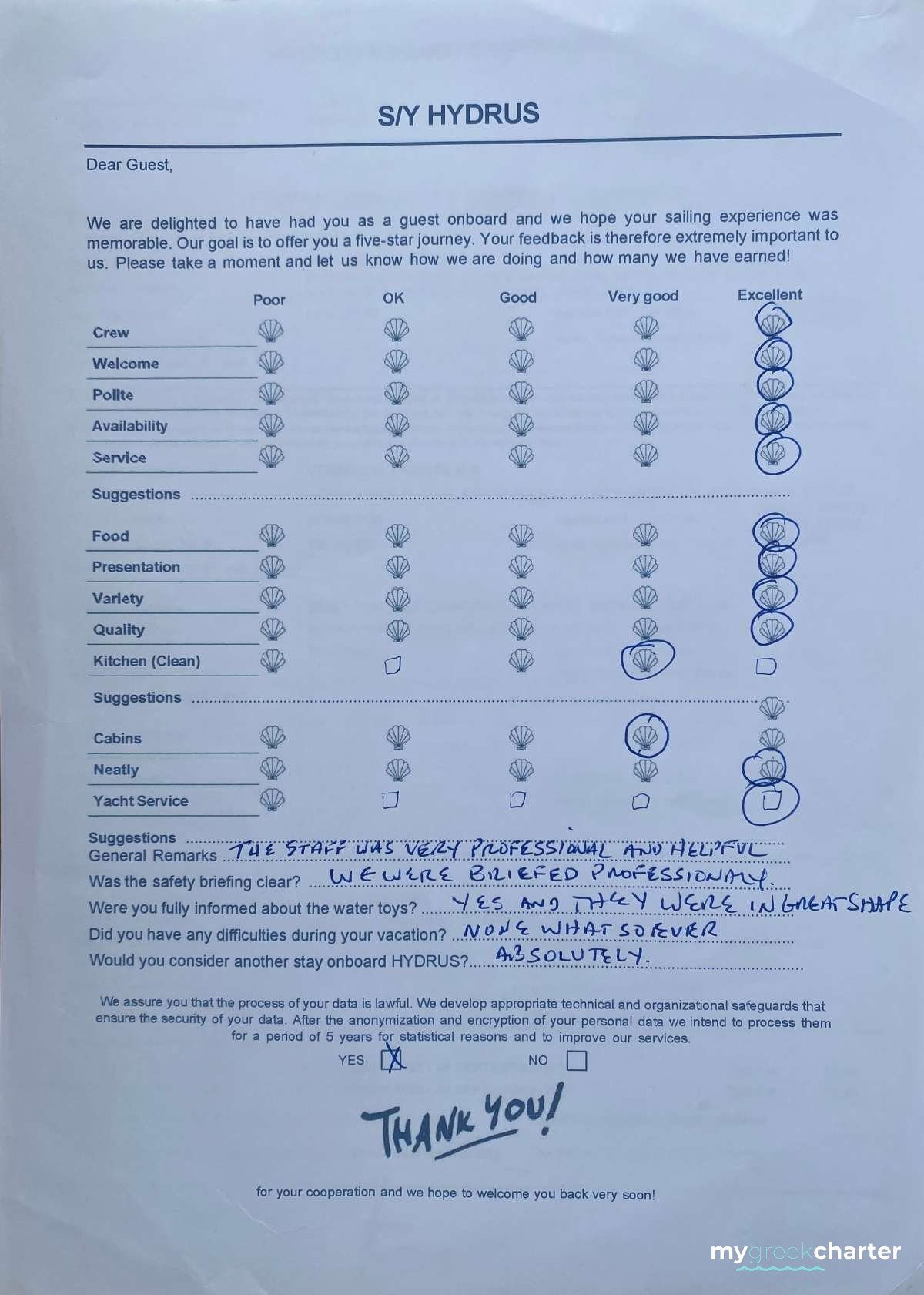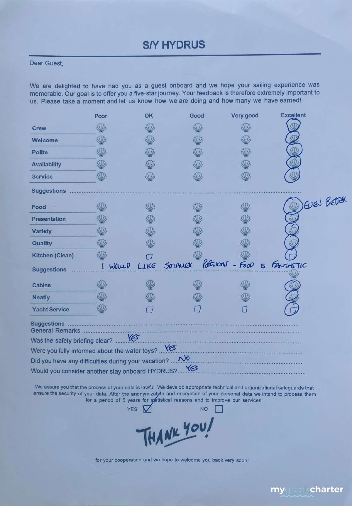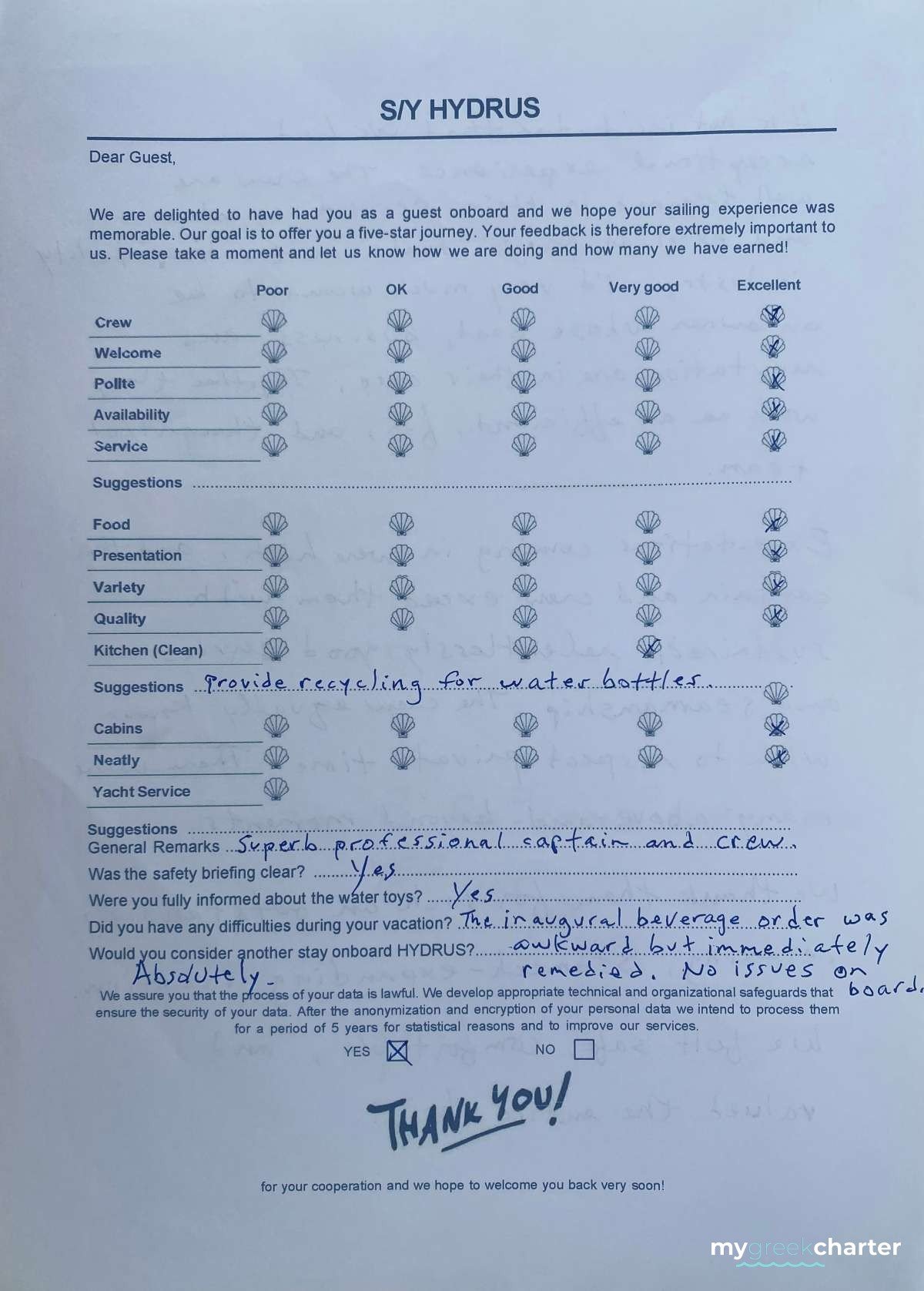 For a sailing catamaran like HYDRUS, the expected APA is 20% to 35% of the charter price (€4,400 - €7,700), making the charter cost €26,400 to €29,700. Exact amount will be confirmed after inquiry.