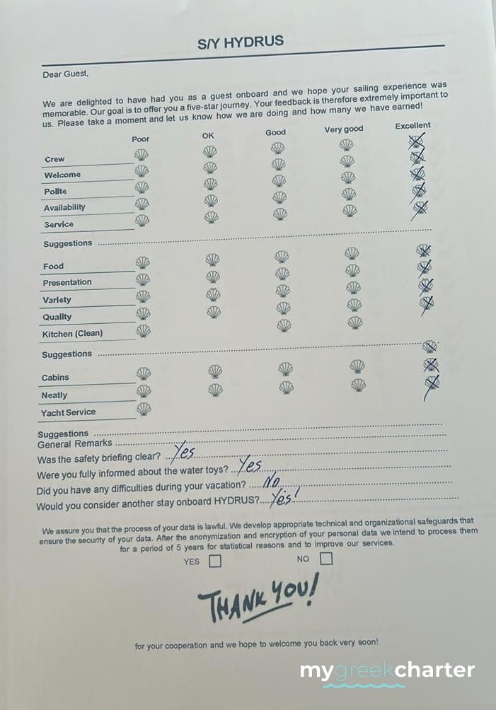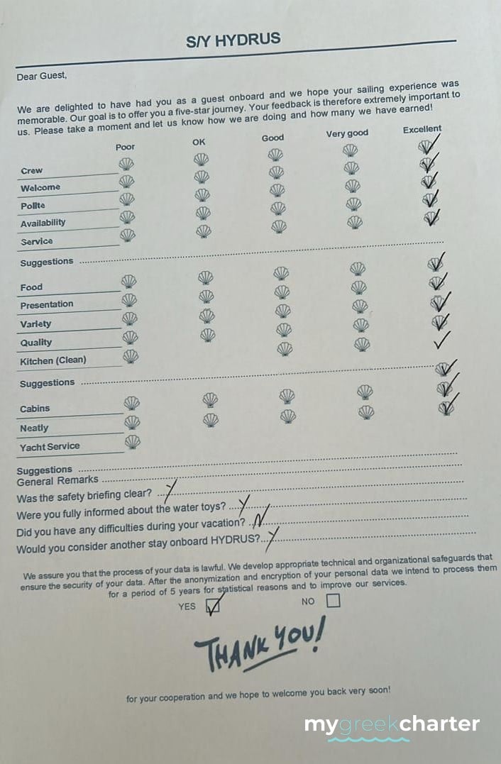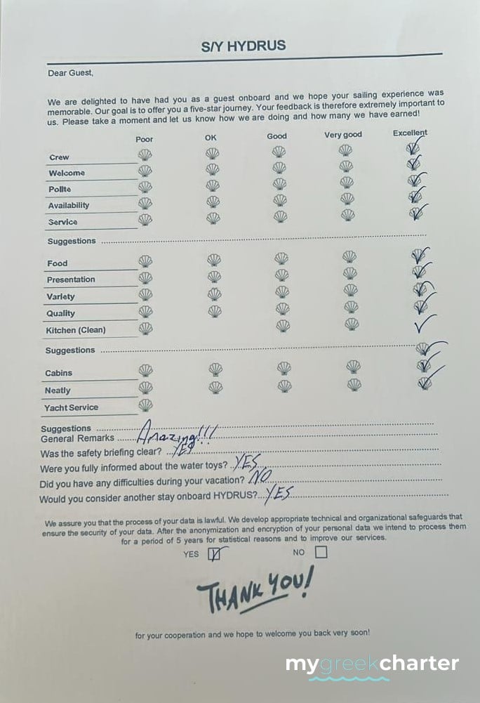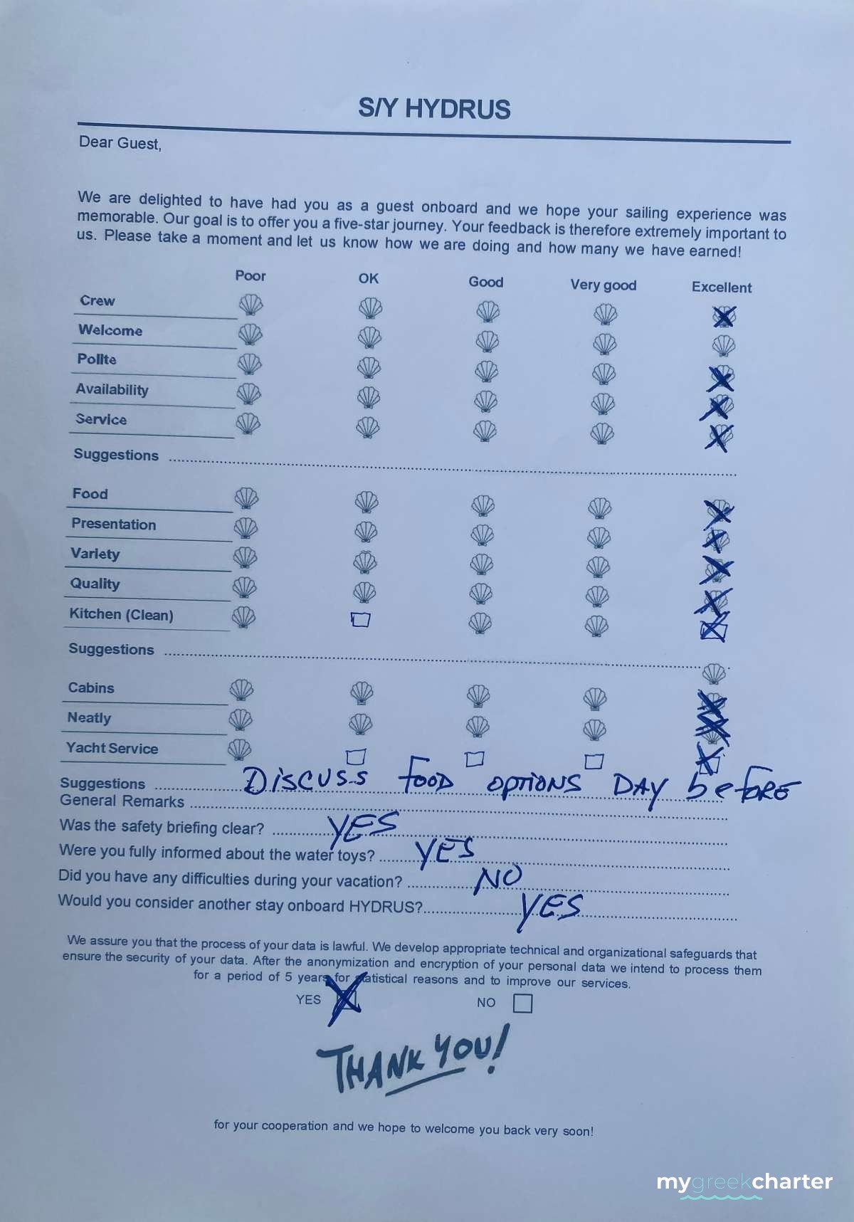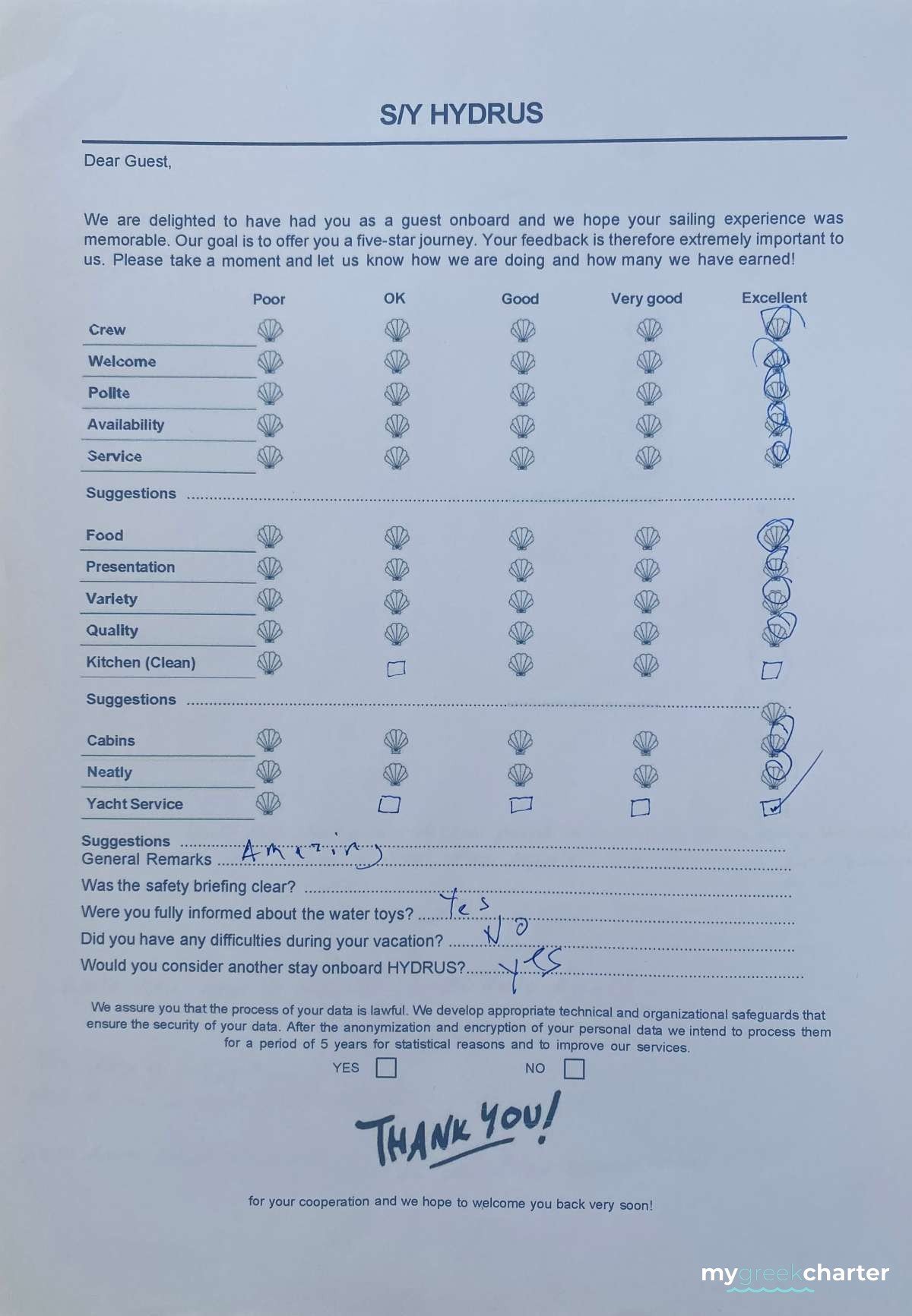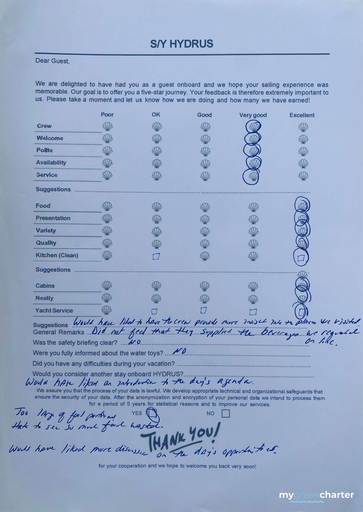 For a sailing catamaran like HYDRUS, the expected APA is 20% to 35% of the charter price (€4,400 - €7,700), making the charter cost €26,400 to €29,700. Exact amount will be confirmed after inquiry.