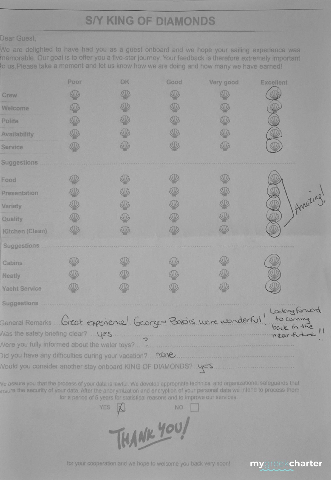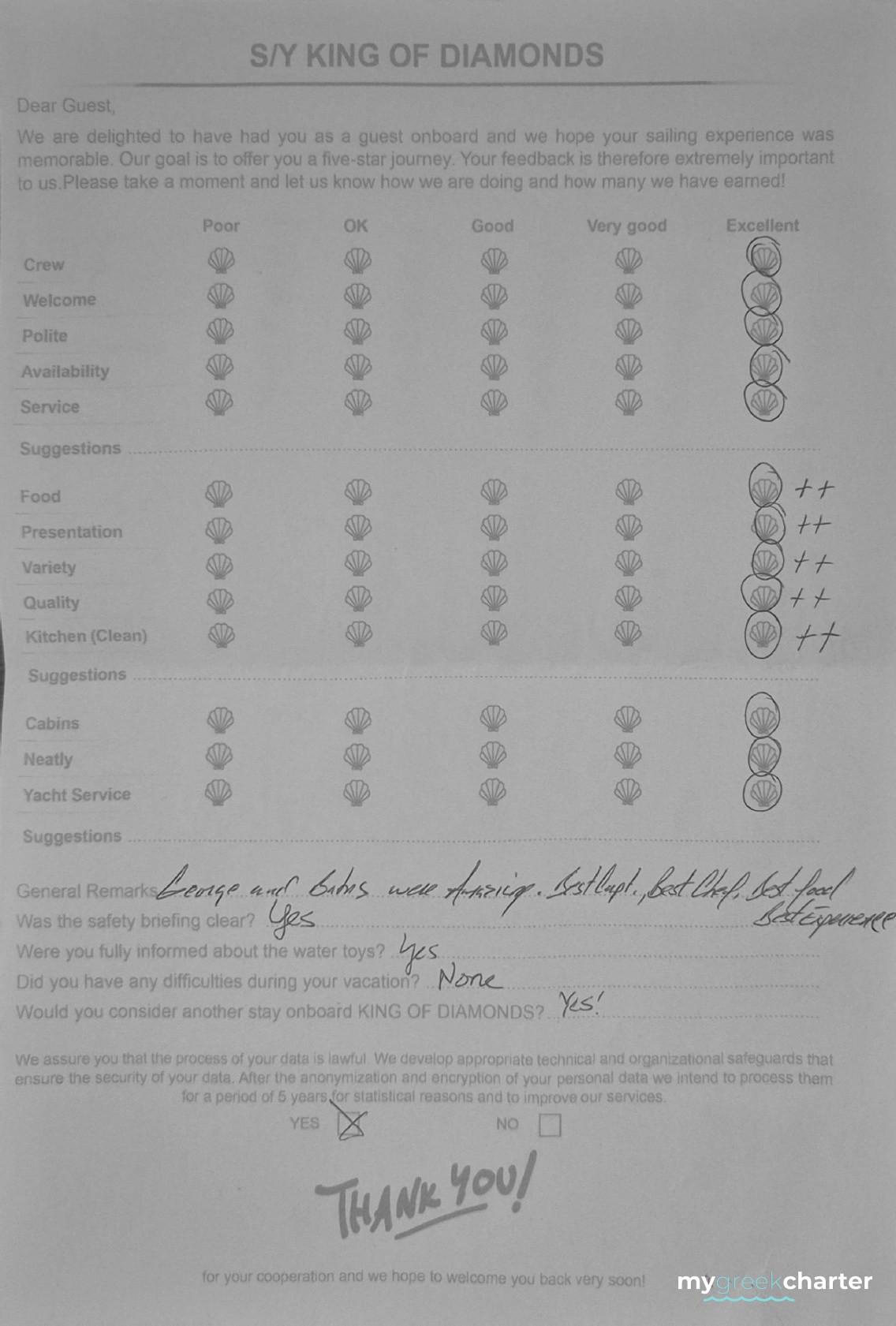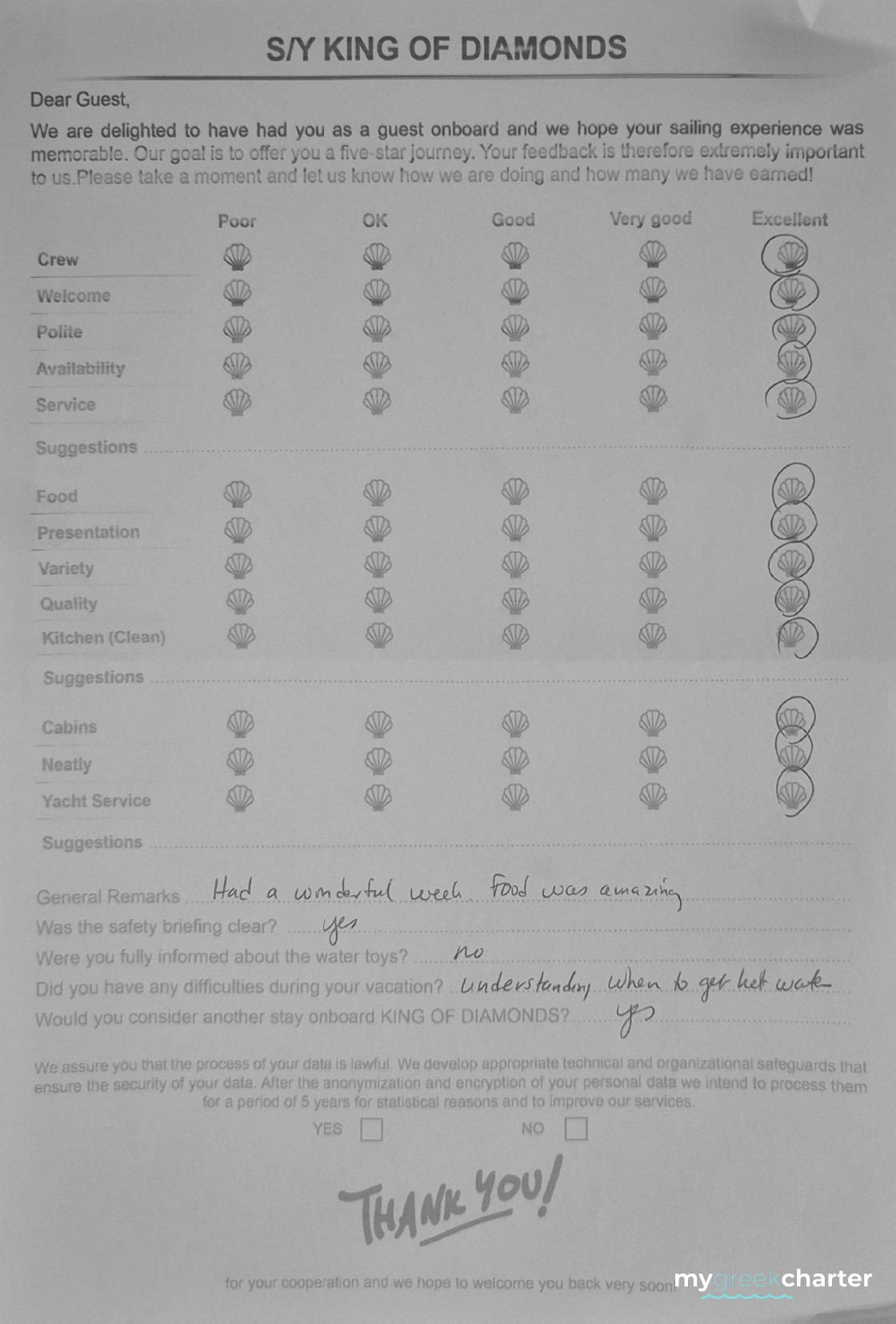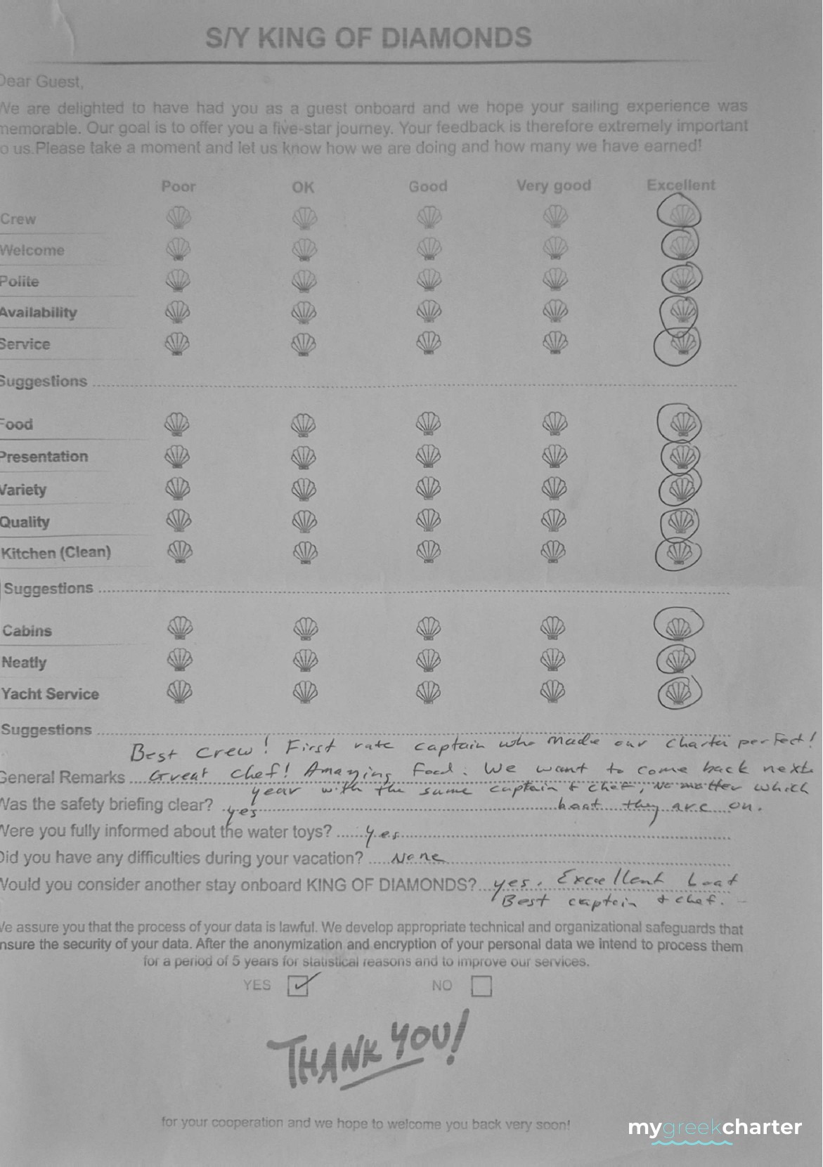 For a sailing catamaran like KING OF DIAMONDS, the expected APA is 20% to 35% of the charter price (€3,300 - €5,775), making the charter cost €19,800 to €22,275. Exact amount will be confirmed after inquiry.