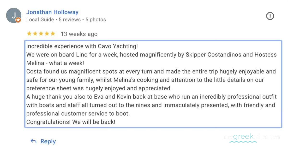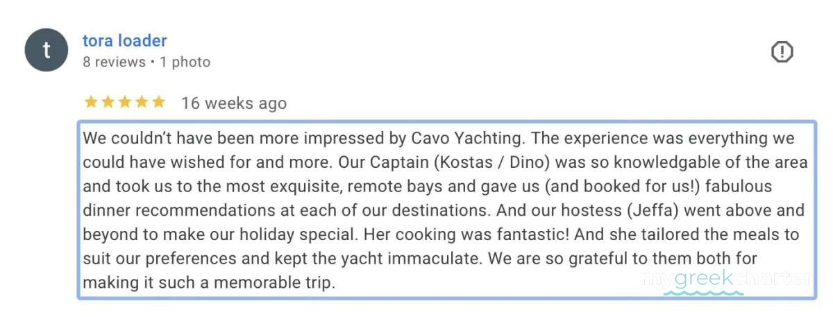 Truly sensational and what dreams really are made of. The hospitality at every turn, the "Mama-Mia" quays and the wonderful food - 30 years of holidaying knocked out of the park by one week in Greece with Cavo. Thank you !!