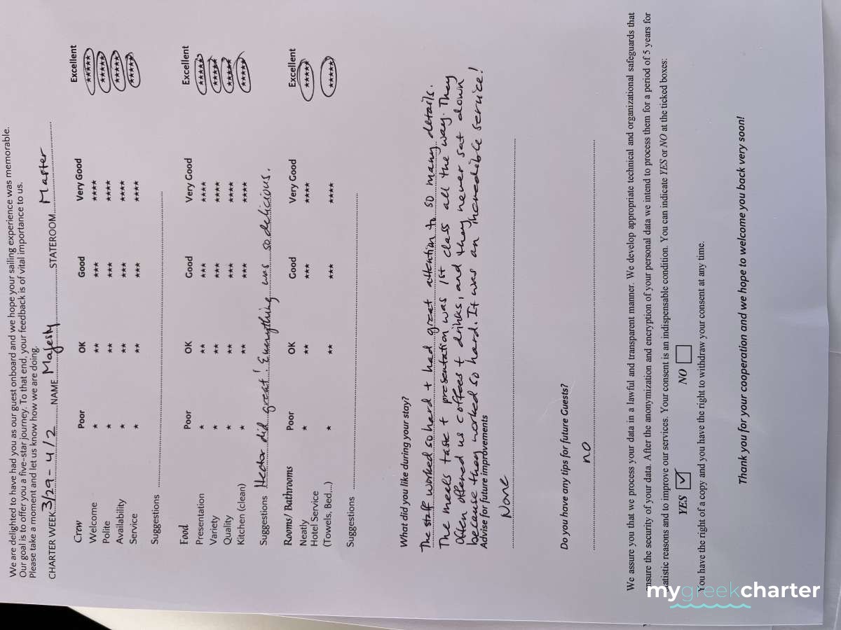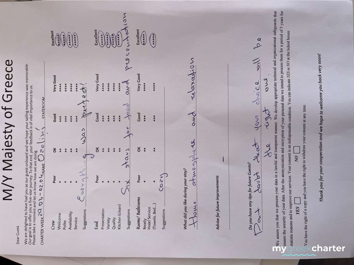 For a power catamaran like MAJESTY OF GREECE, the expected APA is 20% to 35% of the charter price (€6,800 - €11,900), making the charter cost €40,800 to €45,900. Exact amount will be confirmed after inquiry.