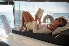 Comfort, not complicated. Full air conditioning, Wi-Fi, an indoor audio system, and a Smart TV/TV in the saloon cover the downtime hours, and there is an outdoor shower for the quick rinse before you head back inside.