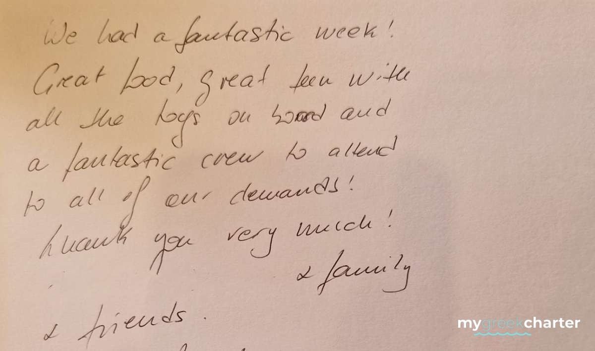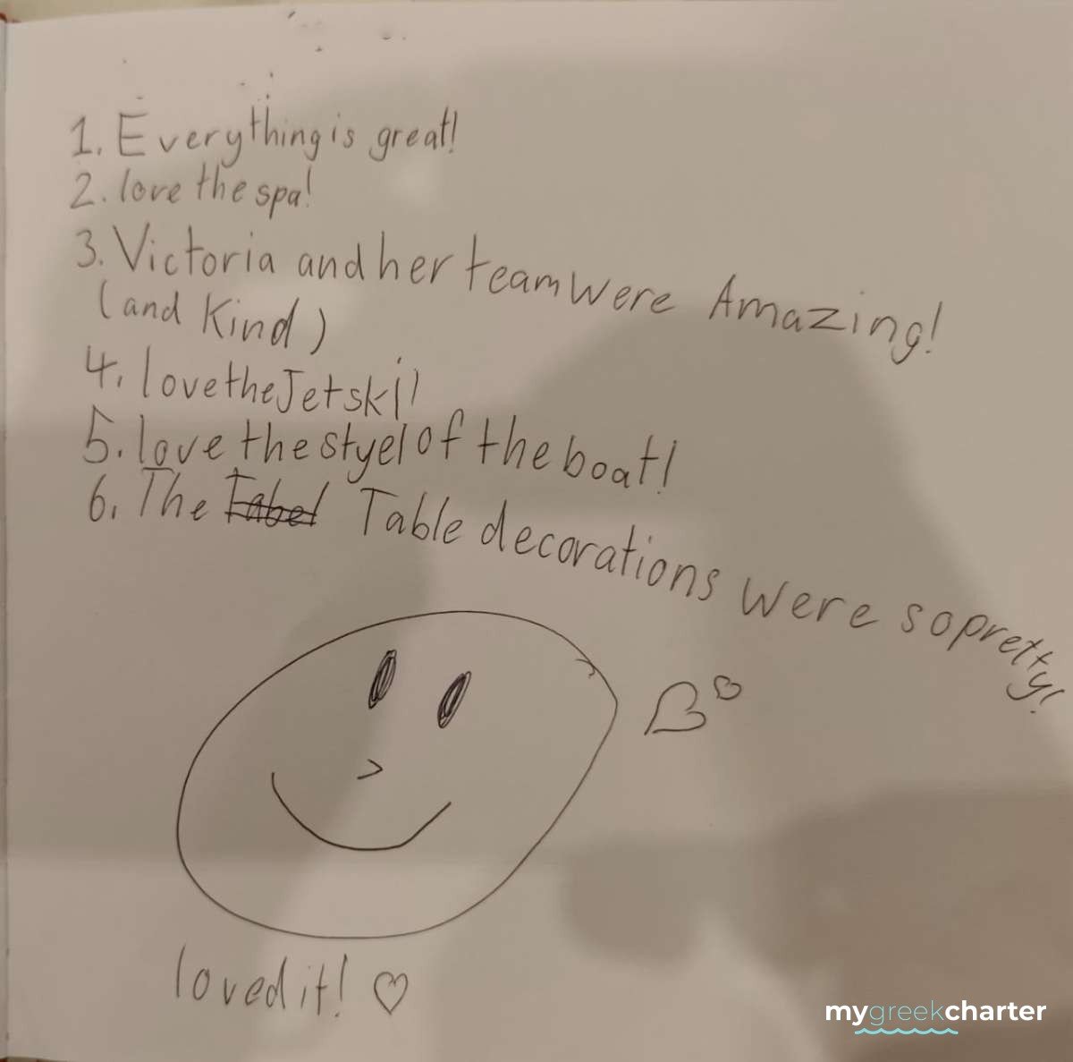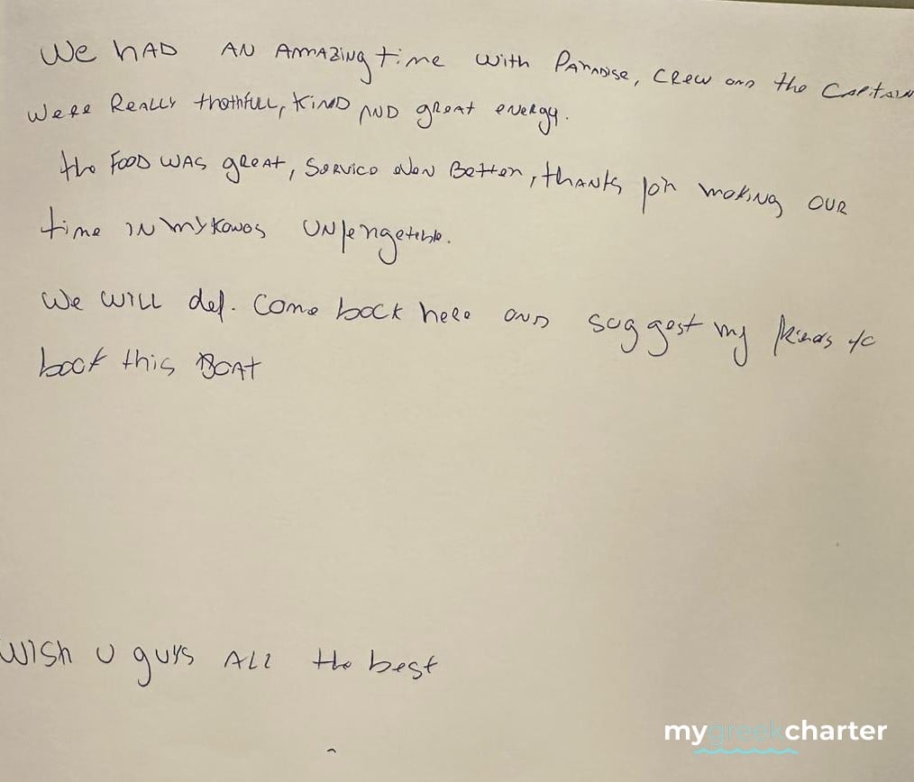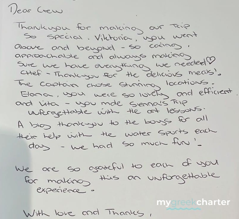 Tatiana, Val, Maria, Captain Aris, Nicolas, Chef Antonis, Vassilis, George and Bakir we love you!!! You made trip so wonderful.