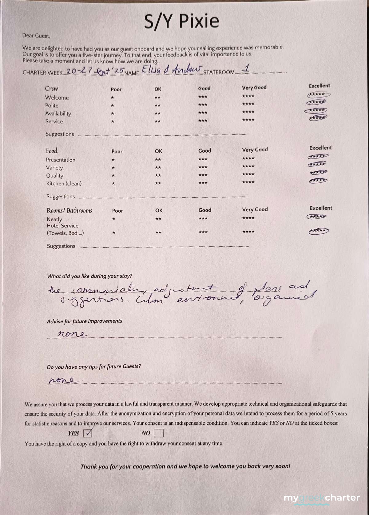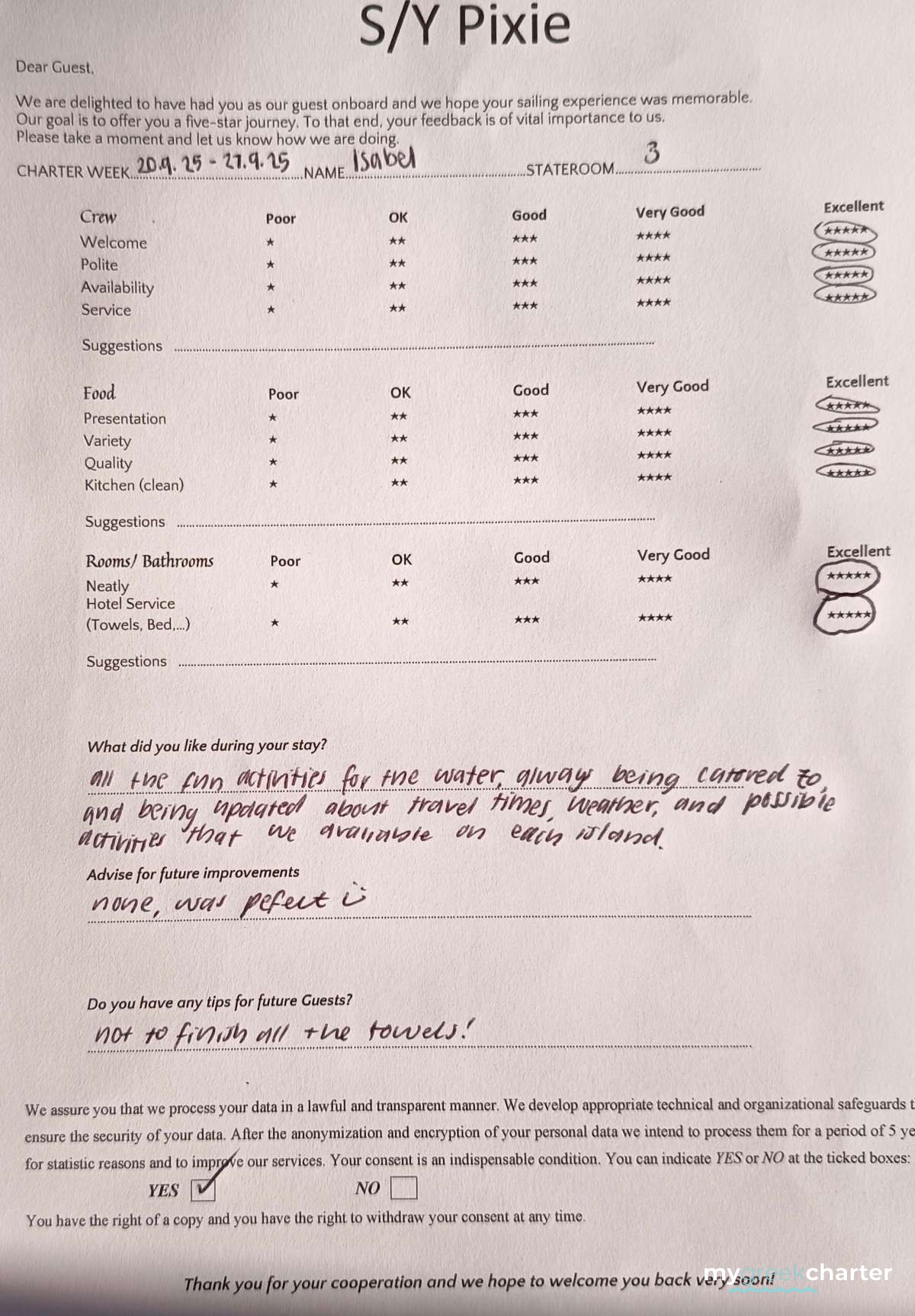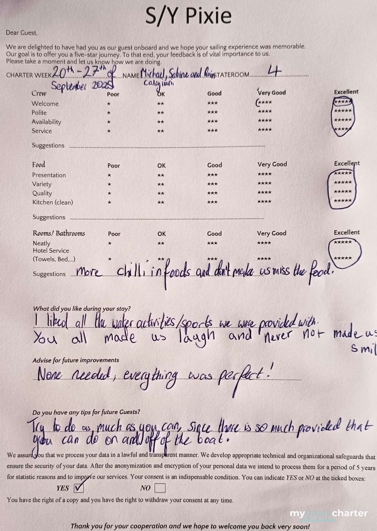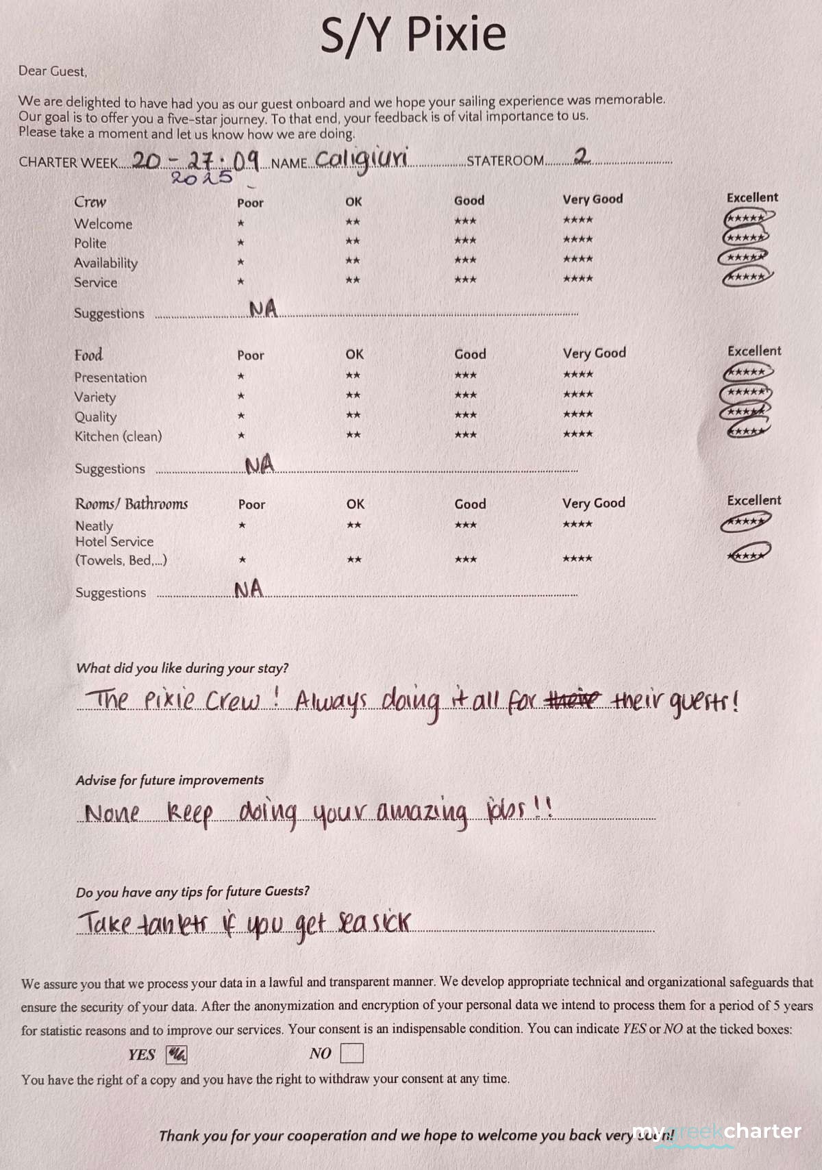 I Loved Catamaran Pixie and her crew. All the recent work that has been done to make her silent matters—no generator noise, silent pumps, and watermaker. Most people don’t ask about it, but once you’re onboard, it makes a big difference, especially at night. Jacuzzi on the bow is a bonus, and the chef’s got serious talent. Fuel burn is only 30L/hr too, so she’s efficient. Feels very guest-focused. Would happily send foodies or anyone picky about peace and quiet on her.