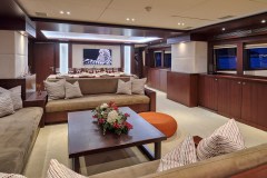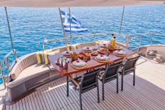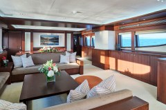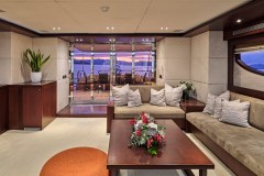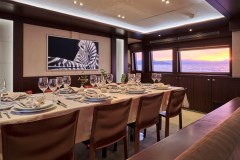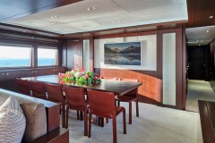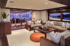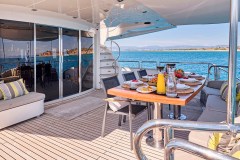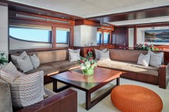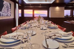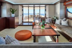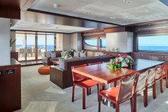 Her main salon has a stylish, modern design with ample seating areas for guests. Her formal dining space can host eight guests. This space has large windows throughout, and the open-plan layout is perfect for large groups socialising. The large sliding glass doors lead out to the aft deck, for more dining space and alfresco living options.