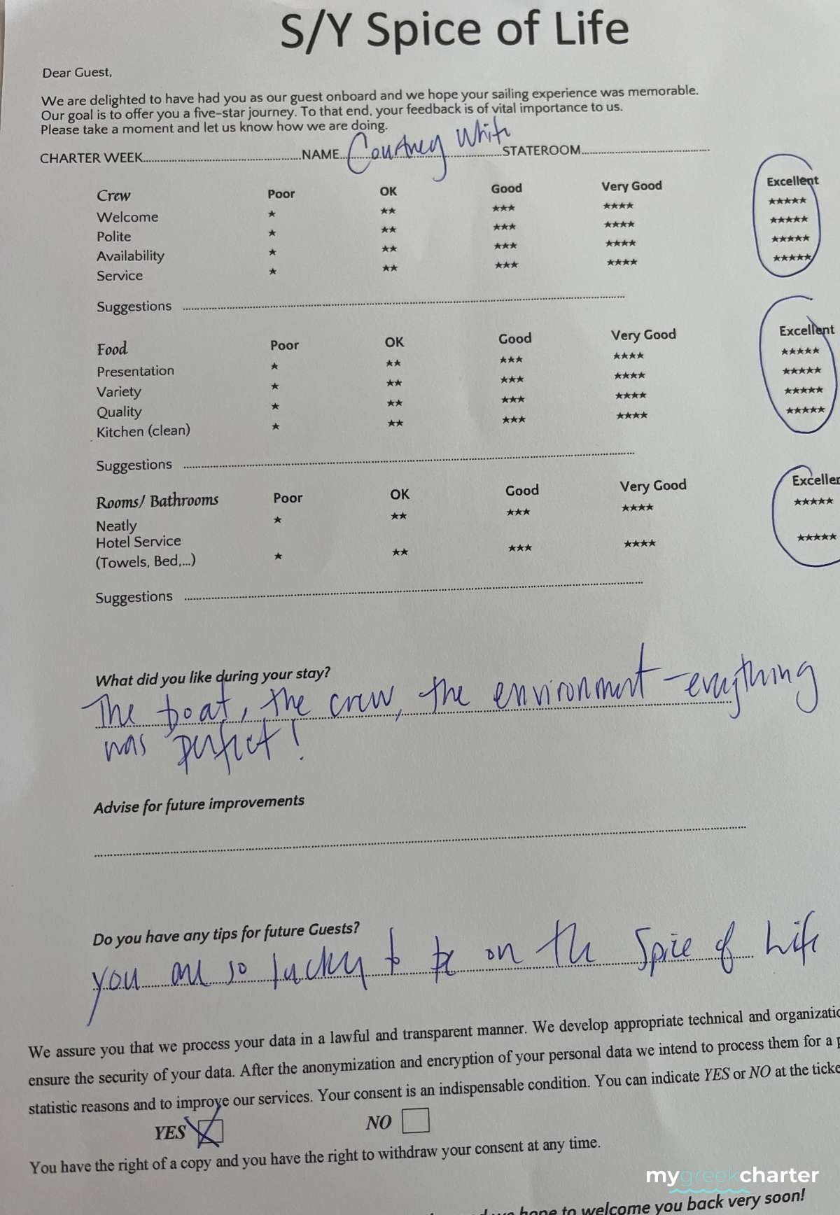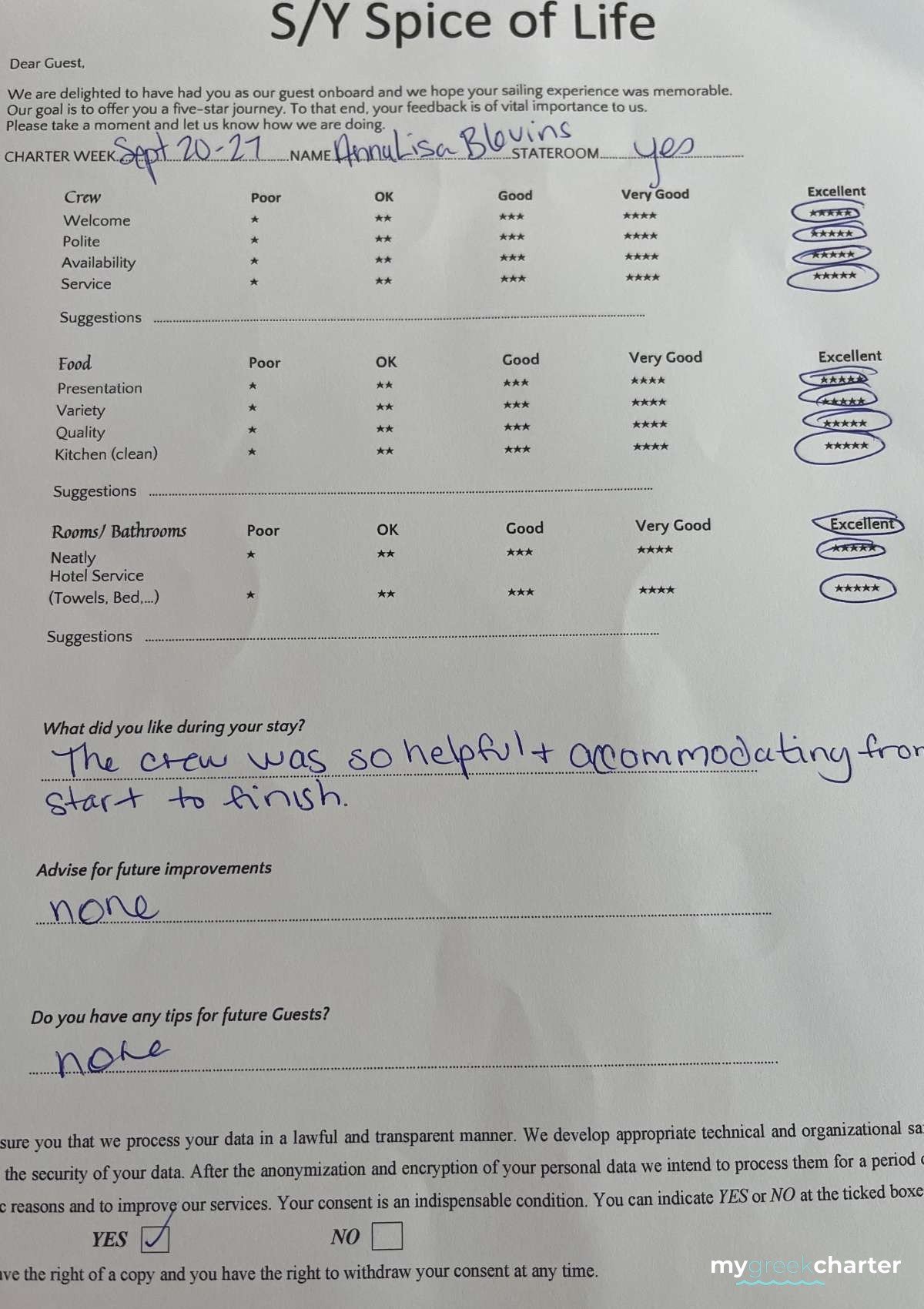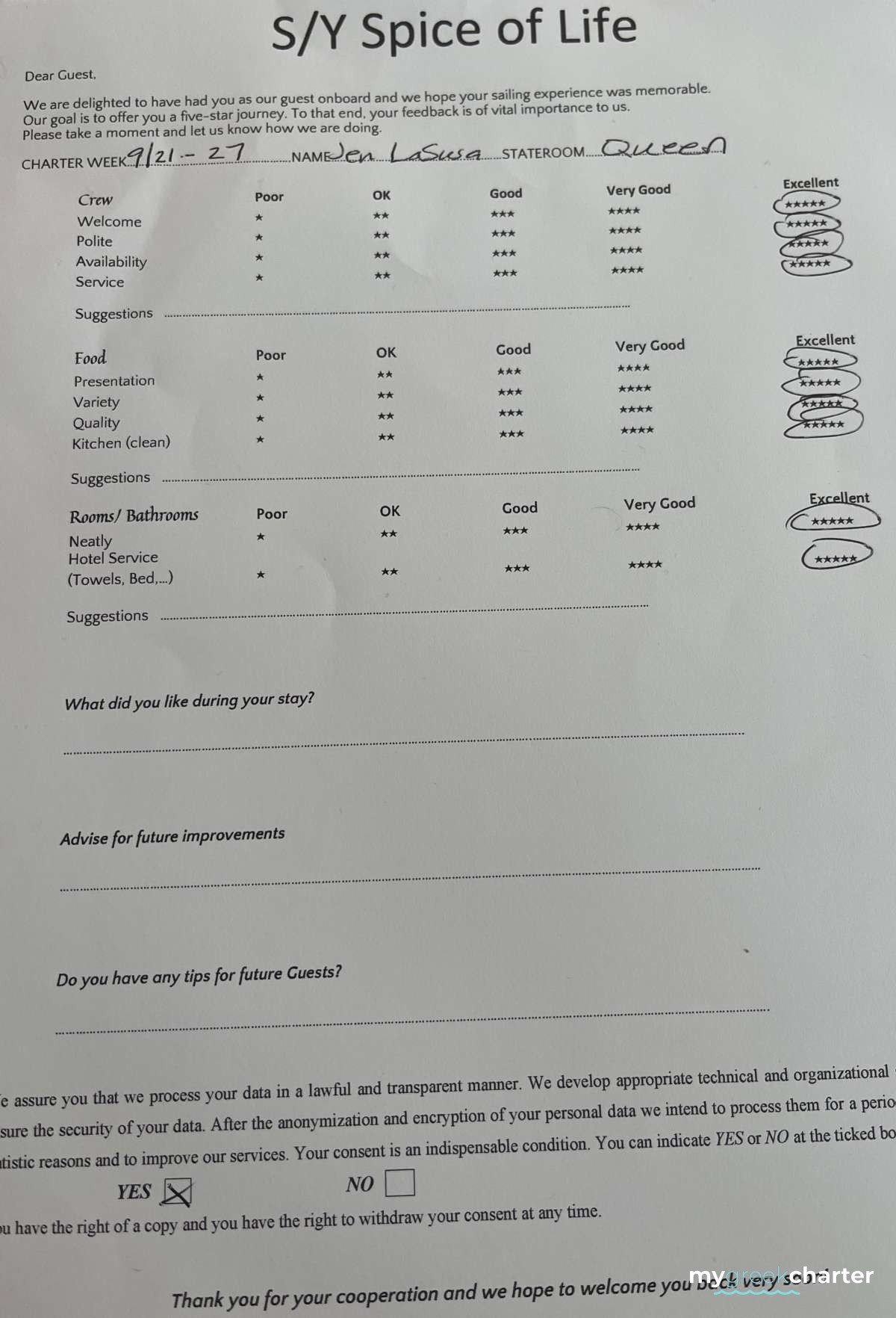 For a sailing catamaran like SPICE OF LIFE, the expected APA is 20% to 35% of the charter price (€7,000 - €12,250), making the charter cost €42,000 to €47,250. Exact amount will be confirmed after inquiry.