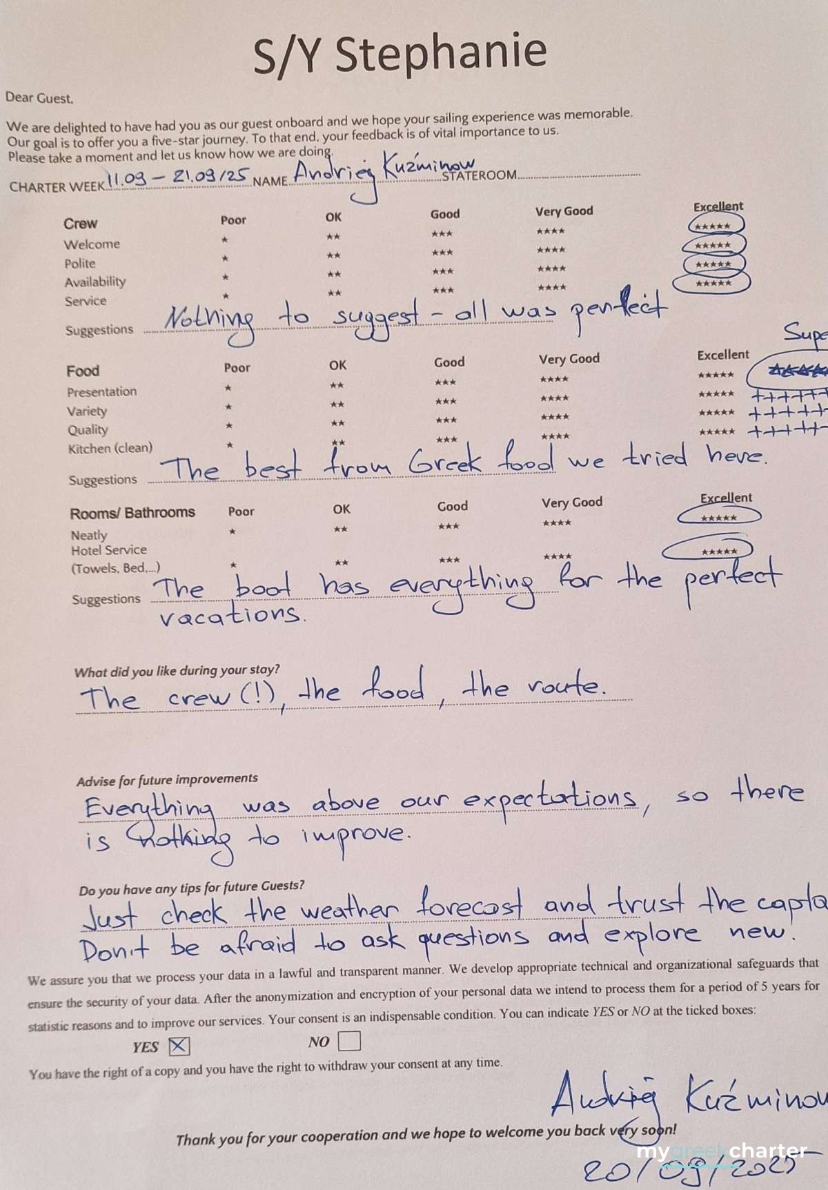 With its innovative green technologies, Stephanie achieves an impressively low carbon footprint, allowing you to explore the world’s most beautiful waters while leaving a minimal environmental trace.