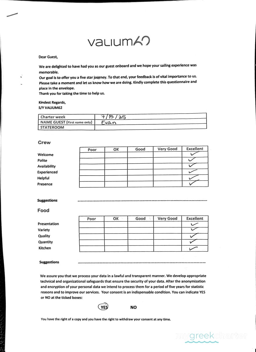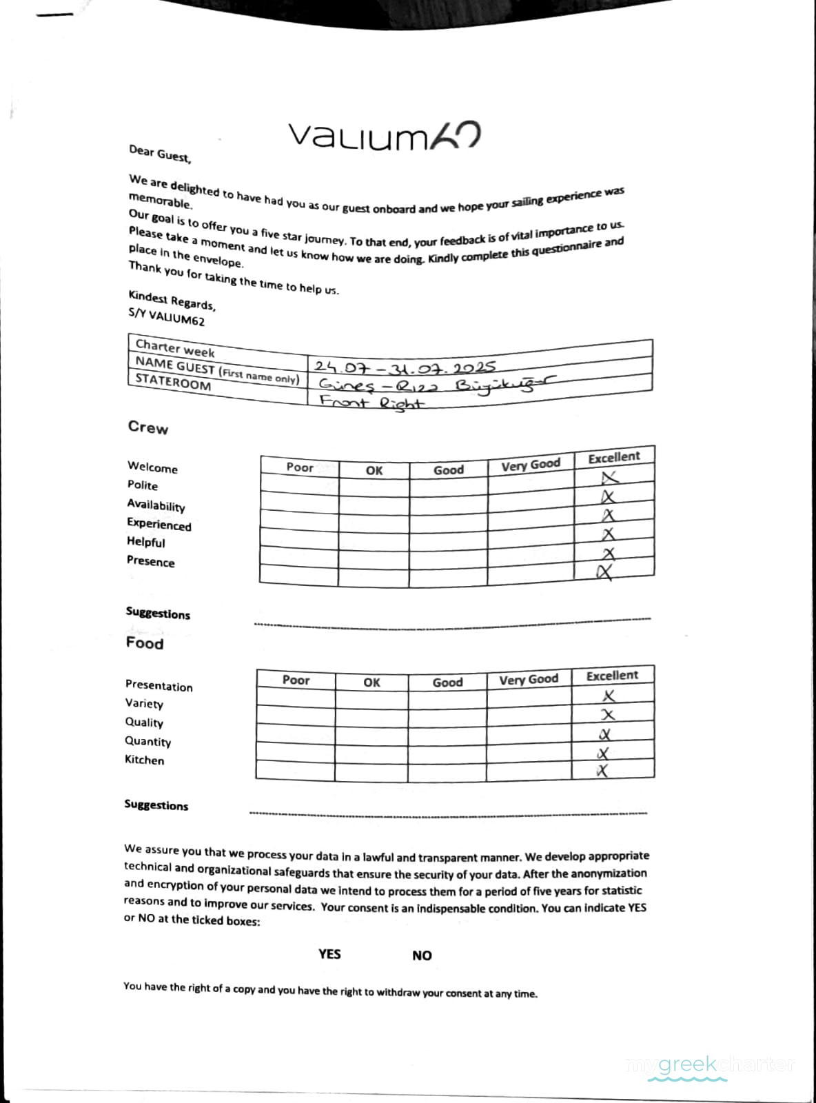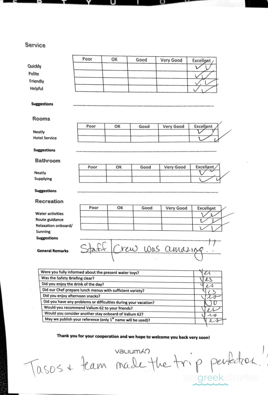 We would like to extend our aprreciation and thanks to entire team aboard the Valium 62 for the exceptional experience we had during our recent chartered cruise.
